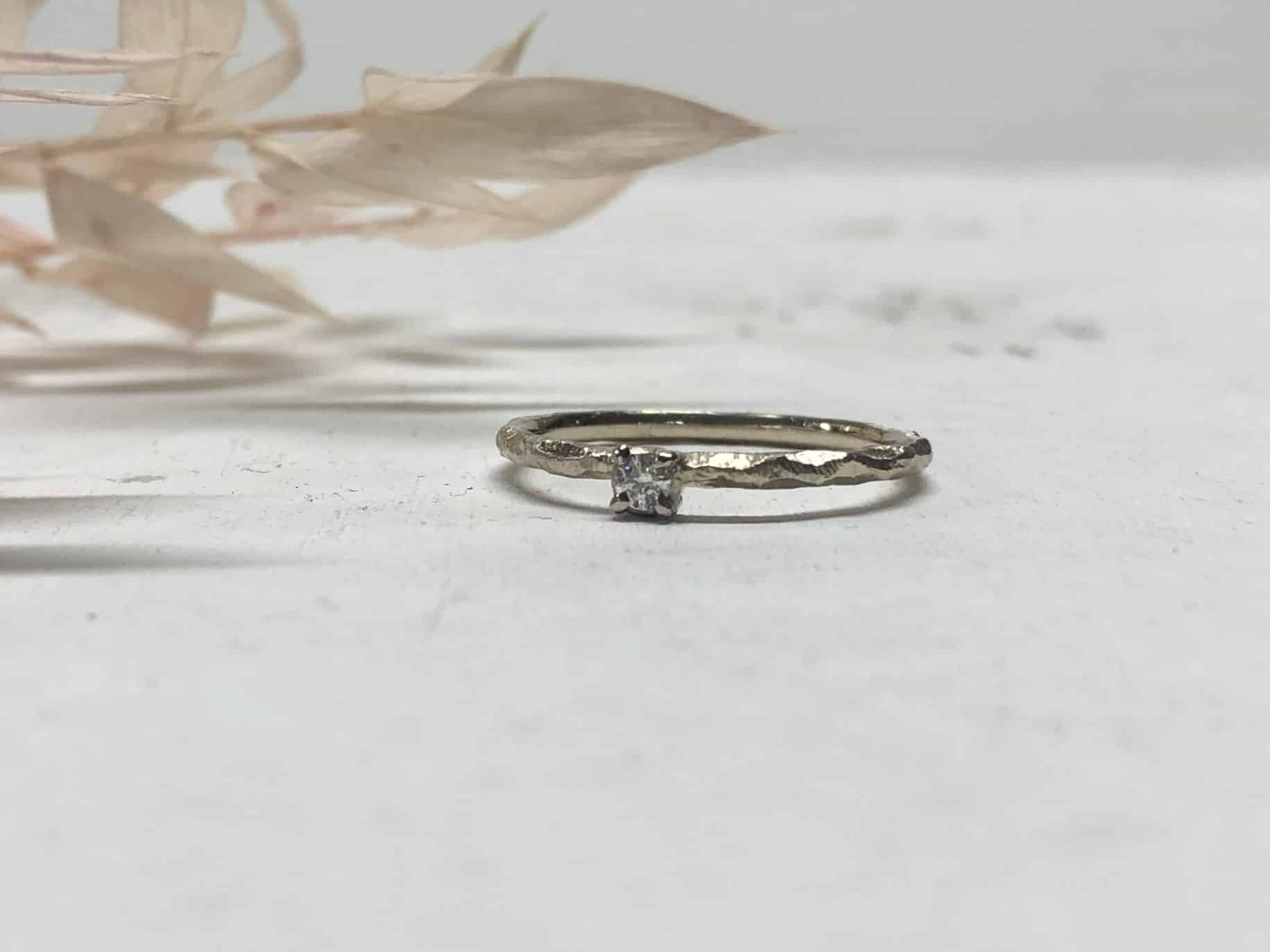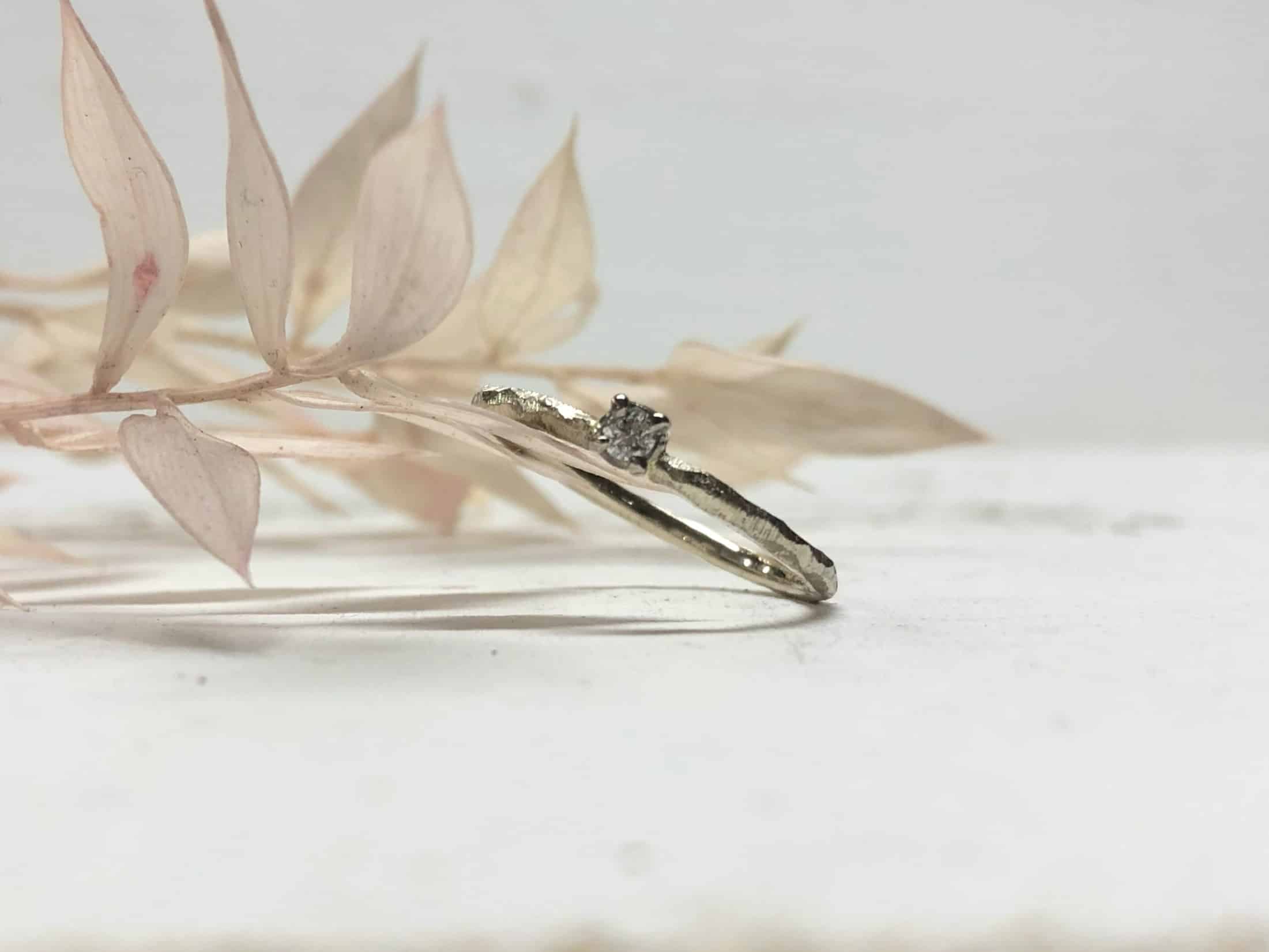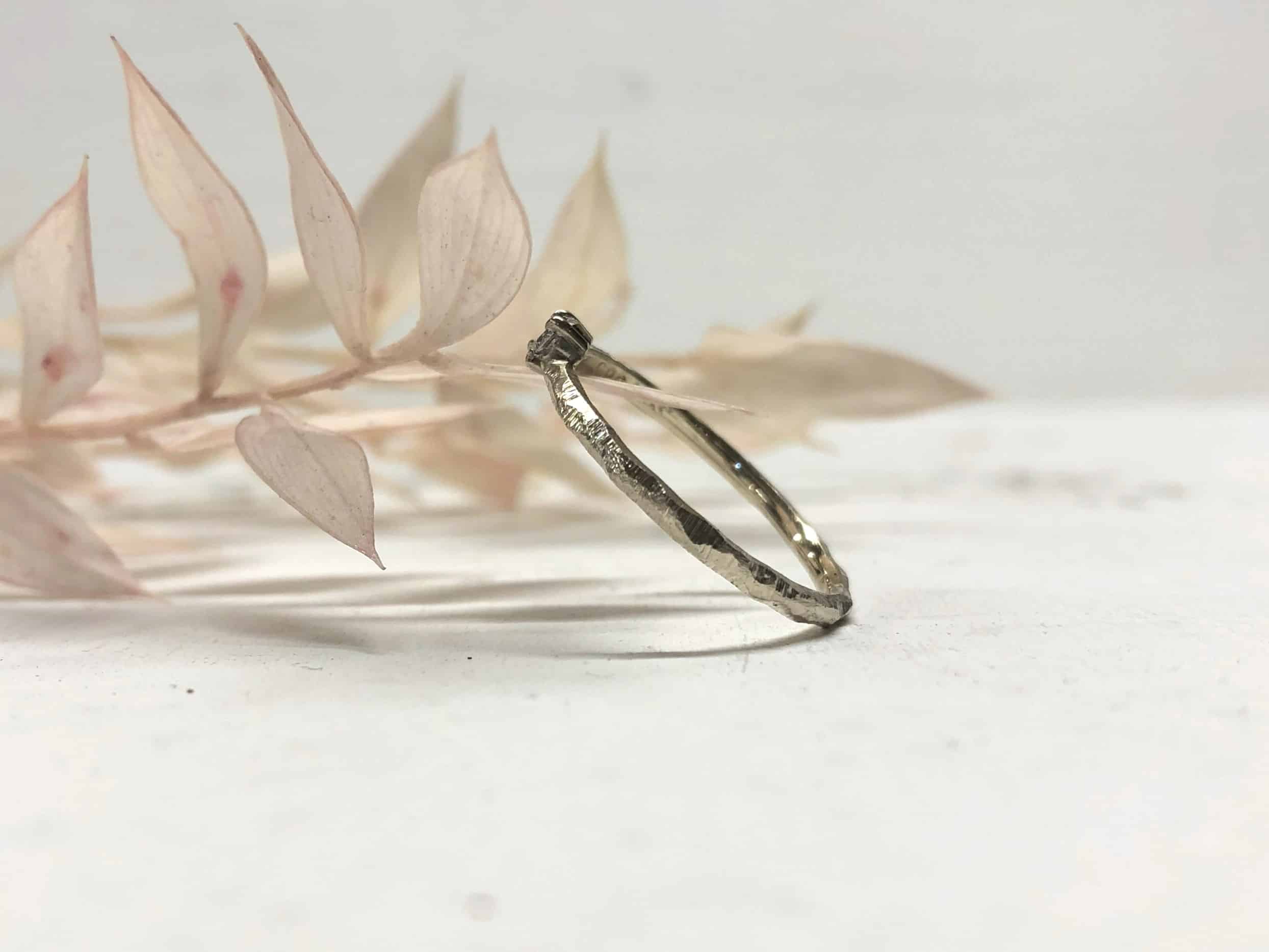Die Oberfläche ist gekerbt mit Facetten und schön robust. Mit verschiedenen Goldschmiedewerkzeugen wird die Struktur in liebevoller Handarbeit auf dem Ring aufgearbeitet. So erzeugen wir eine tolle natürliche und florale Struktur, die kleine Kratzer und Macken, die durchs Tragen entstehen, versteckt. Ein facettierter Vorsteckring mit Stein sieht auch immer handgefertigt aus, einfach eine tolle Unikatoptik.