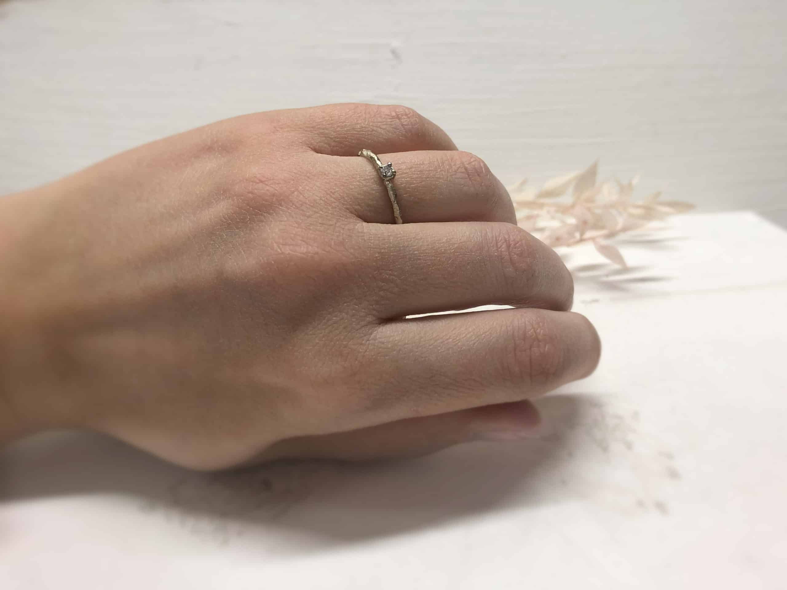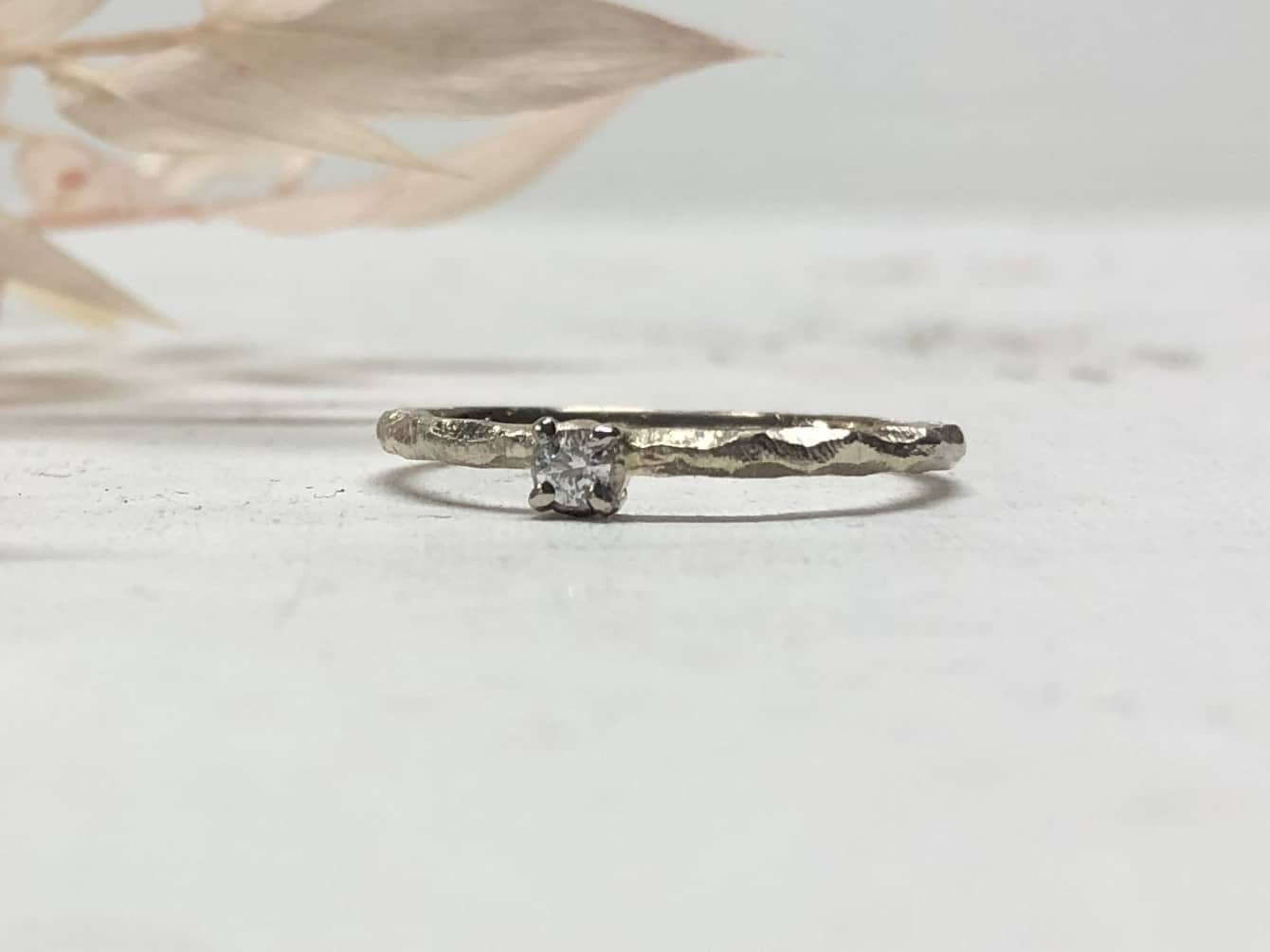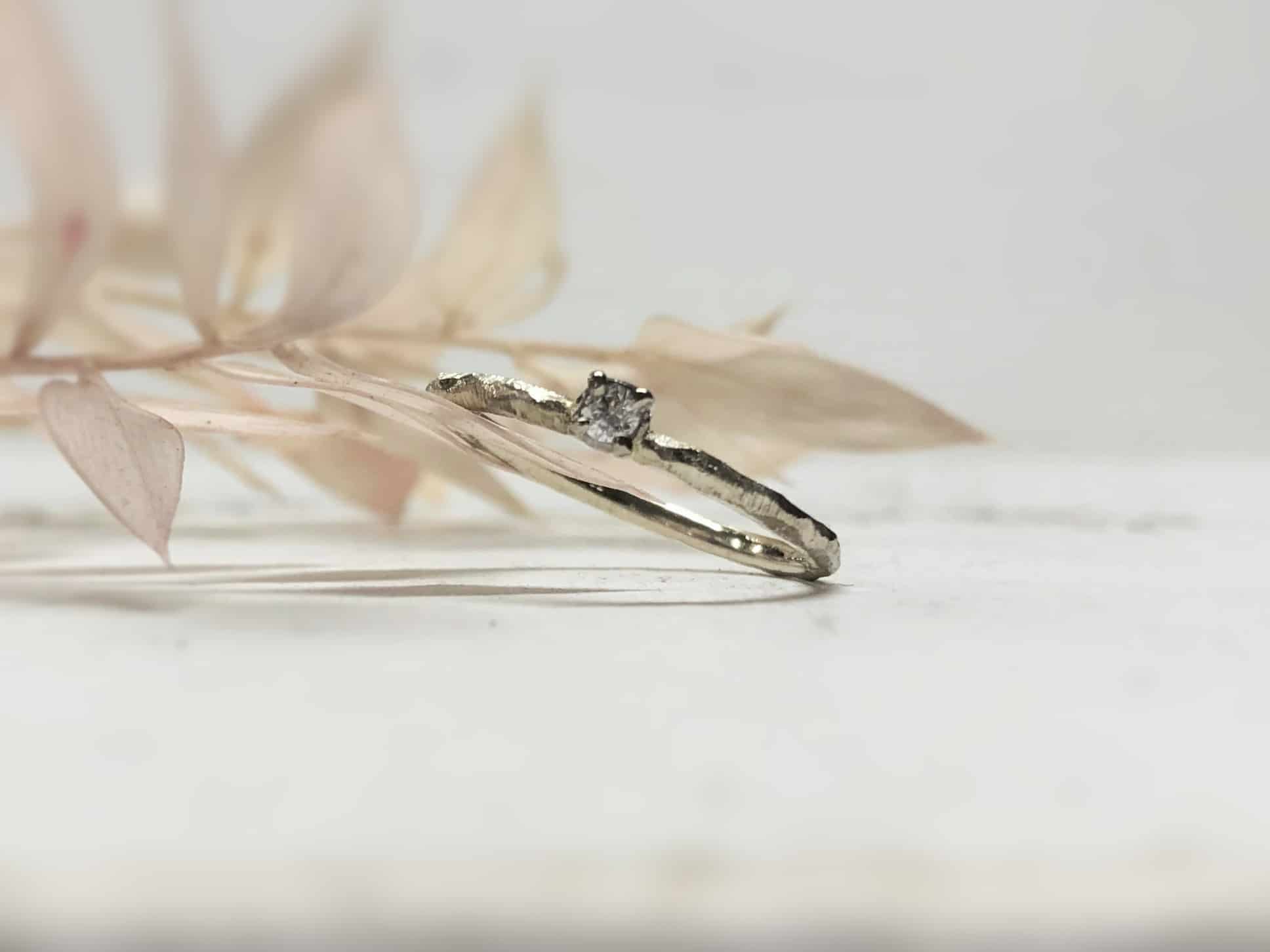Die Oberfläche ist gekerbt mit Facetten und schön robust. Mit verschiedenen Goldschmiedewerkzeugen wird die Struktur in liebevoller Handarbeit auf dem Ring aufgearbeitet. So erzeugen wir eine tolle natürliche und florale Struktur, die kleine Kratzer und Macken, die durchs Tragen entstehen, versteckt. Ein facettierter Vorsteckring mit Stein sieht auch immer handgefertigt aus, einfach eine tolle Unikatoptik.