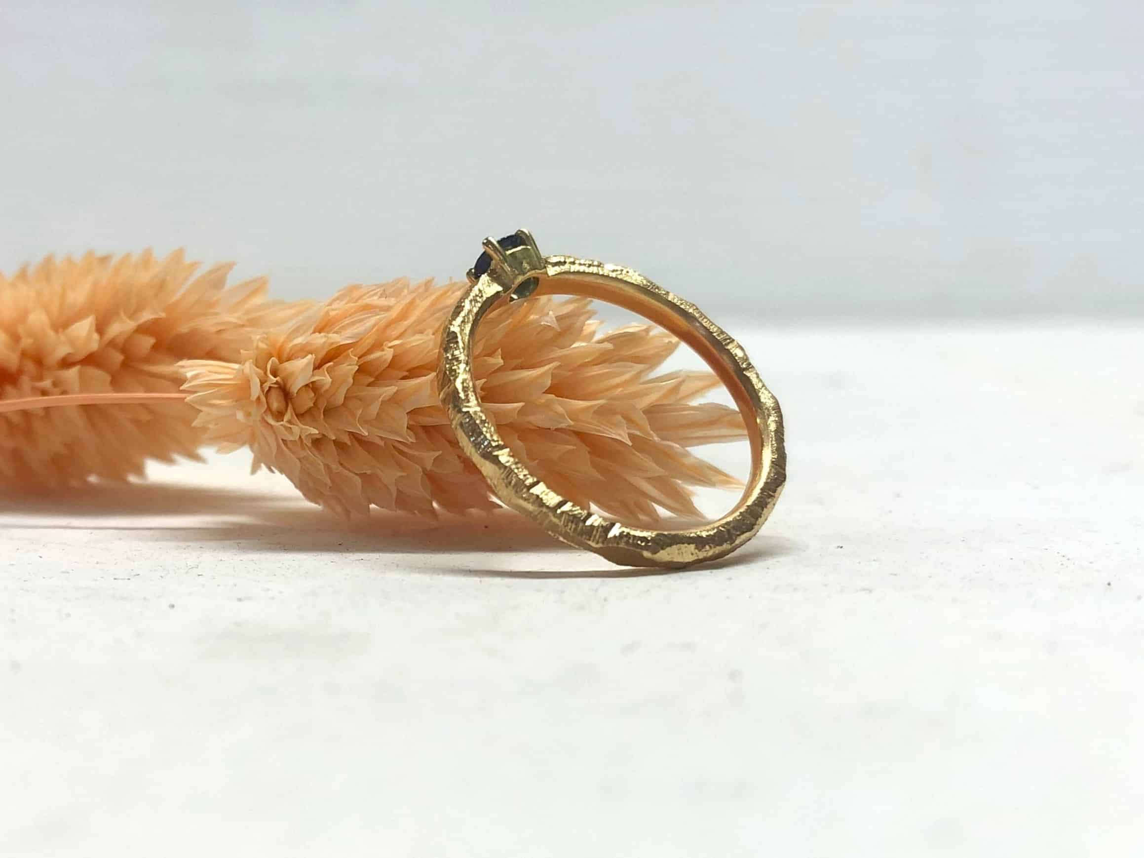 Es ist ein Mix aus Hammerschlagfacetten, gefeilten Facetten und winzigen eingefeilten Kerben. Auch seitlich am Ring ist diese robuste Oberfläche zu finden. Das facettierte Ringband sieht aus wie handgefertigt und genau das macht den Charme des Safirrings aus. Das Ringband erinnert uns immer ein wenig an Felsen, was gut zum Naturthema des Rings passt.