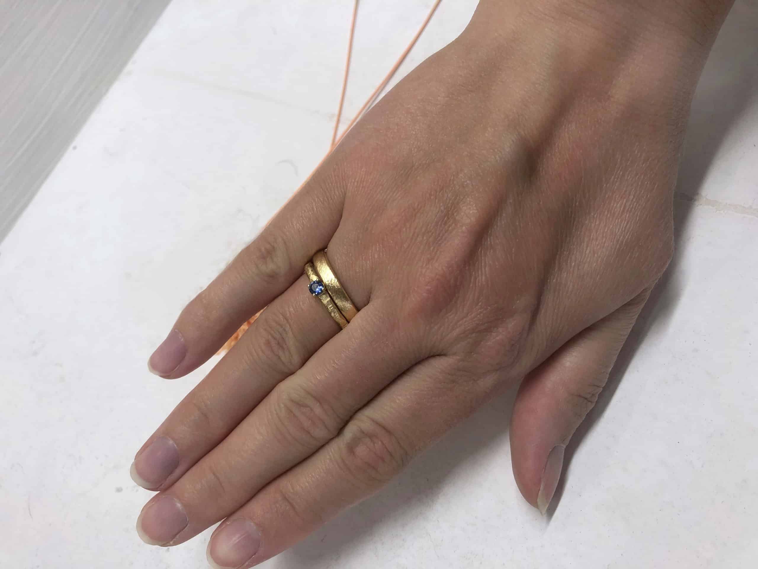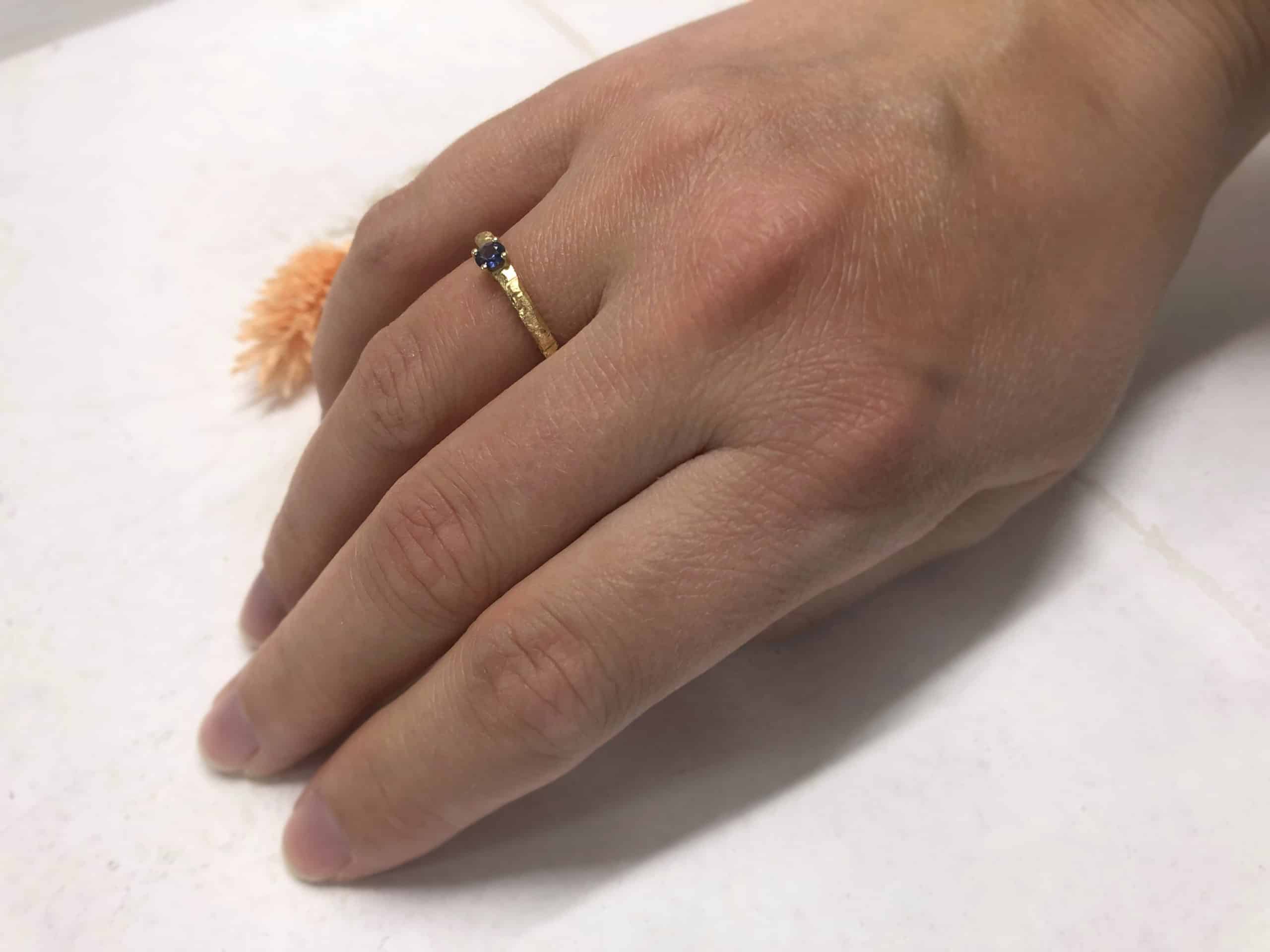 Ein geschmiedeter Goldring mit Safir erhält seine Oberfläche mit verschiedenen Goldschmiedewerkzeugen. Es wird gehämmert bzw. geschmiedet und es kommen diverse Feilen zum Einsatz. Die Oberfläche wirkt sehr lebendig und man sieht eindeutig den Unikatcharakter des Safirrings.