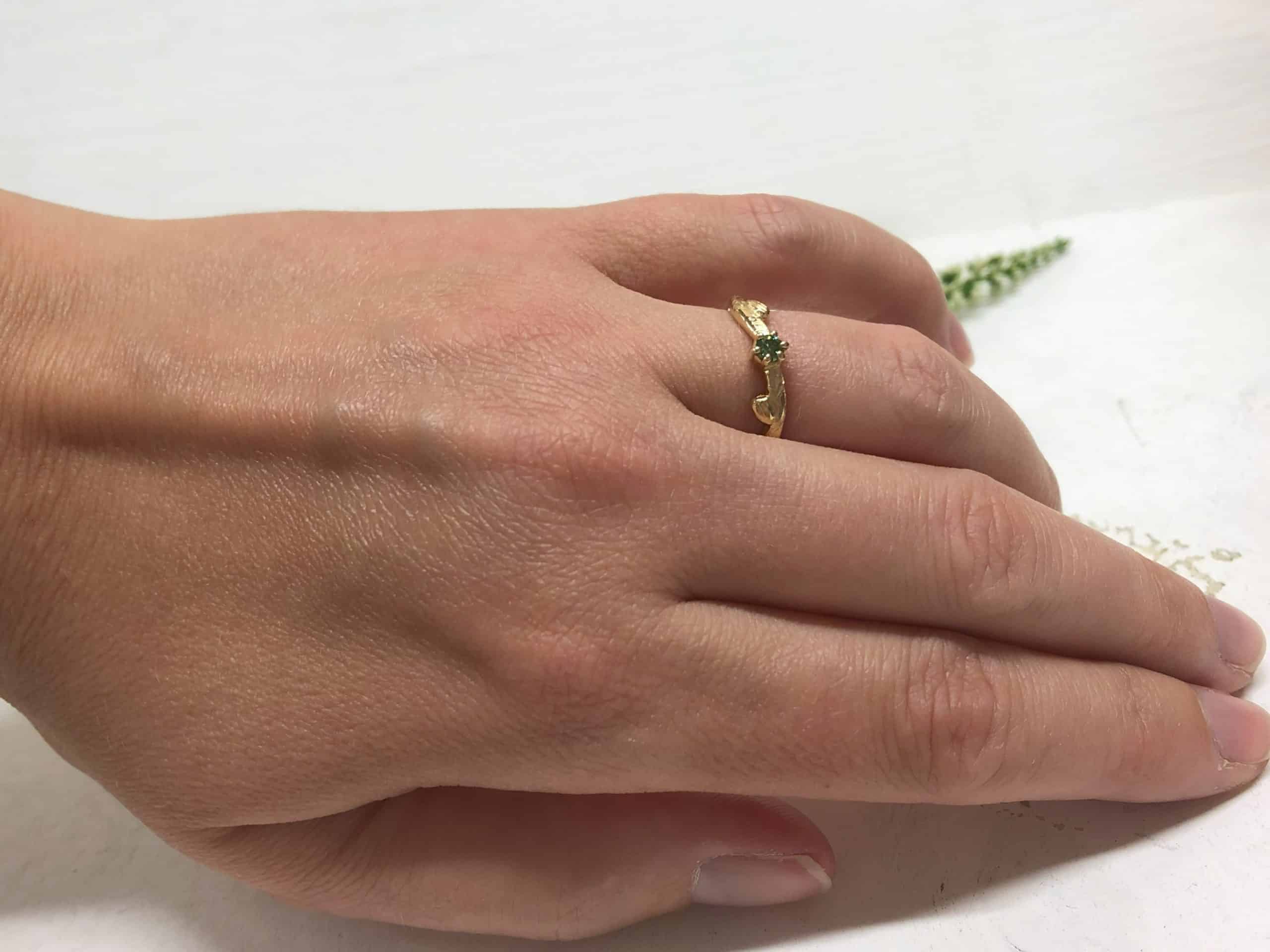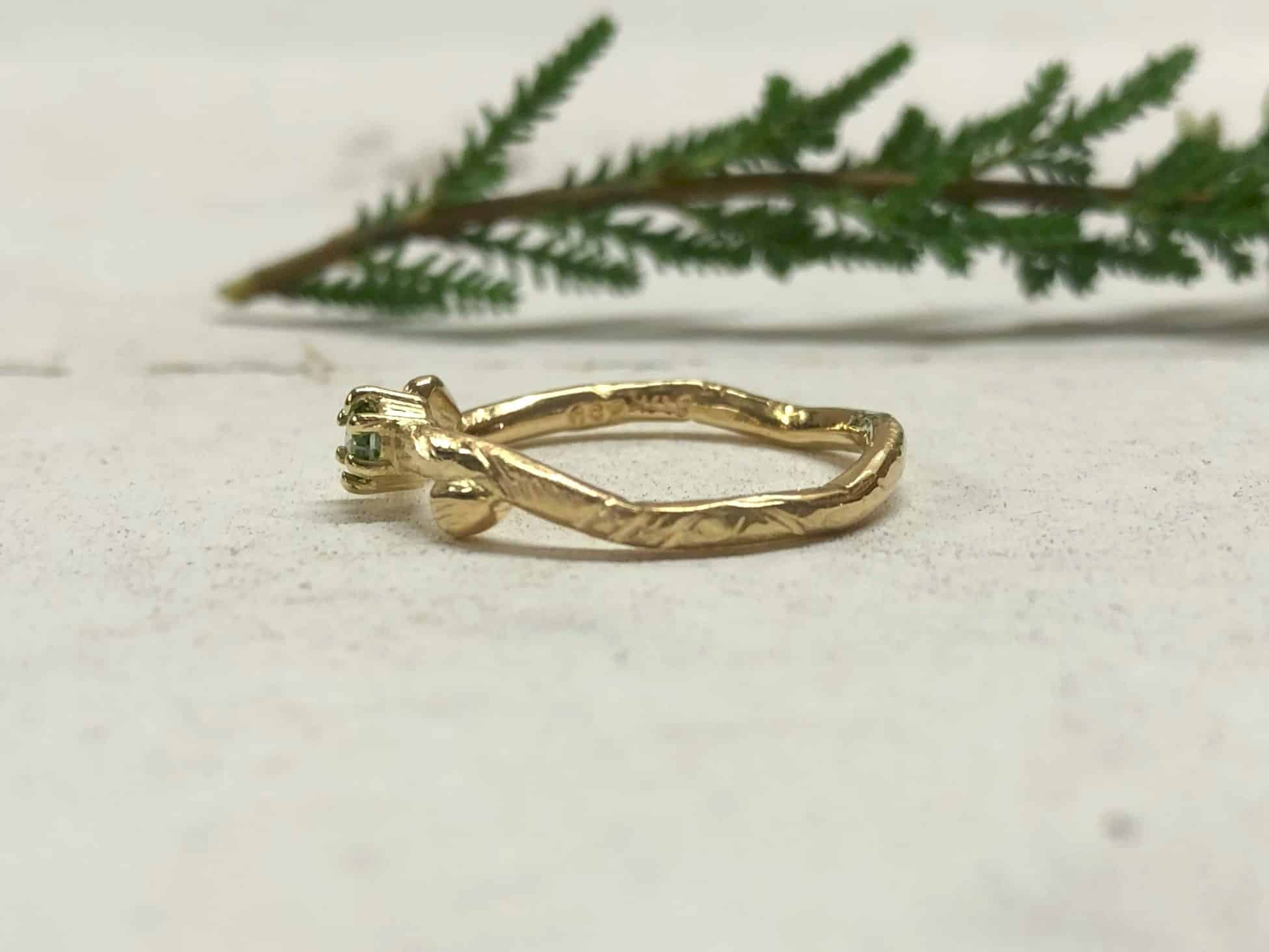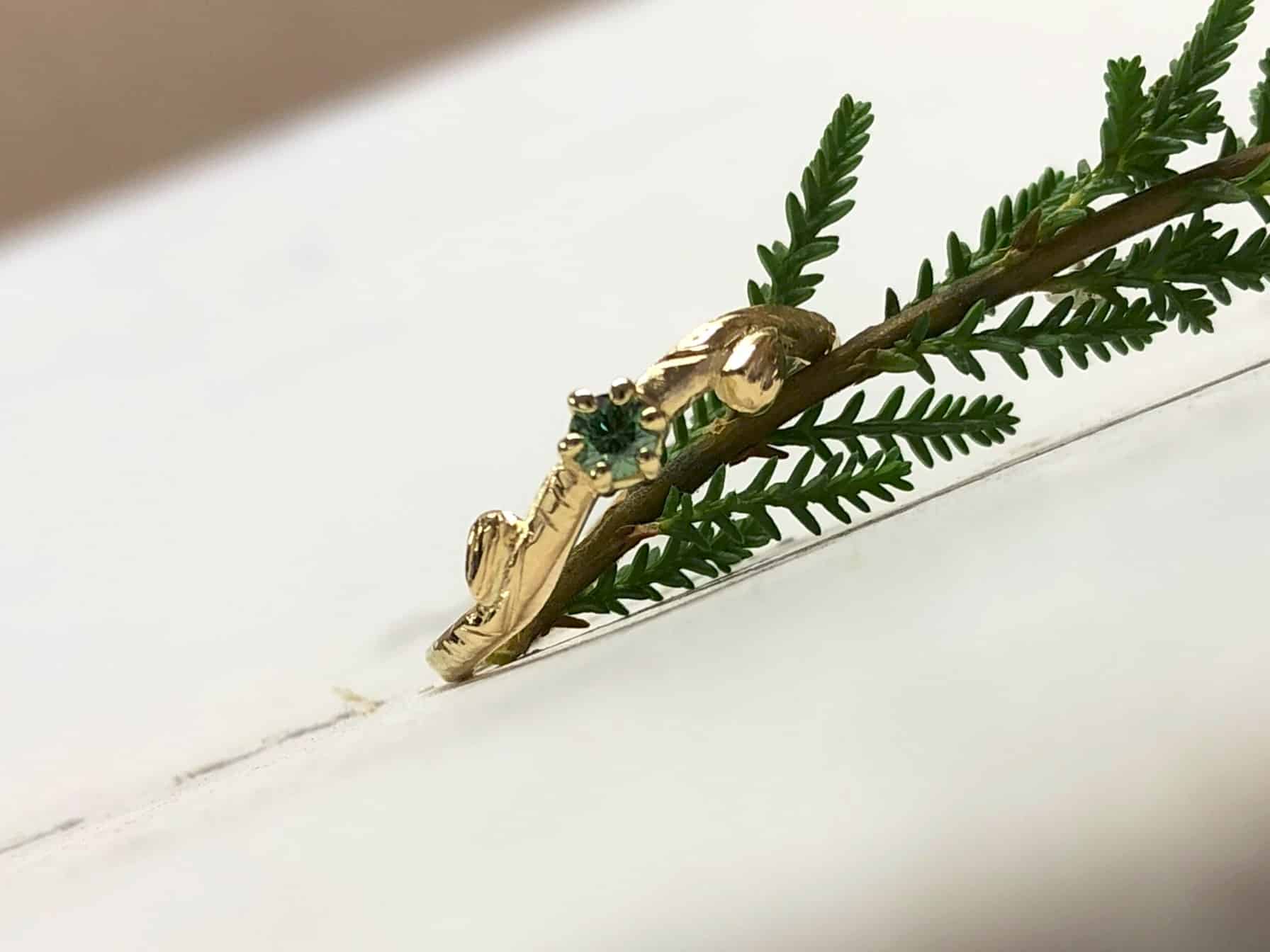 Denn: Da die Knospen und auch die kleinen Äste der 6-kralligen Fassung etwas hervorstehen, könnte man an einem solchen Ring mit Blättern und Stein etwas häufiger hängenbleiben, als man es bei einem schlichten Ring täte. Solltest du lieber eine glatte Zargenfassung (sprich, eine runde, geschlossene Fassung) für den grünen Stein wünschen, so sprich uns einfach an. Denn auch hier können wir für einen Aufpreis nach deinen Wünschen arbeiten.