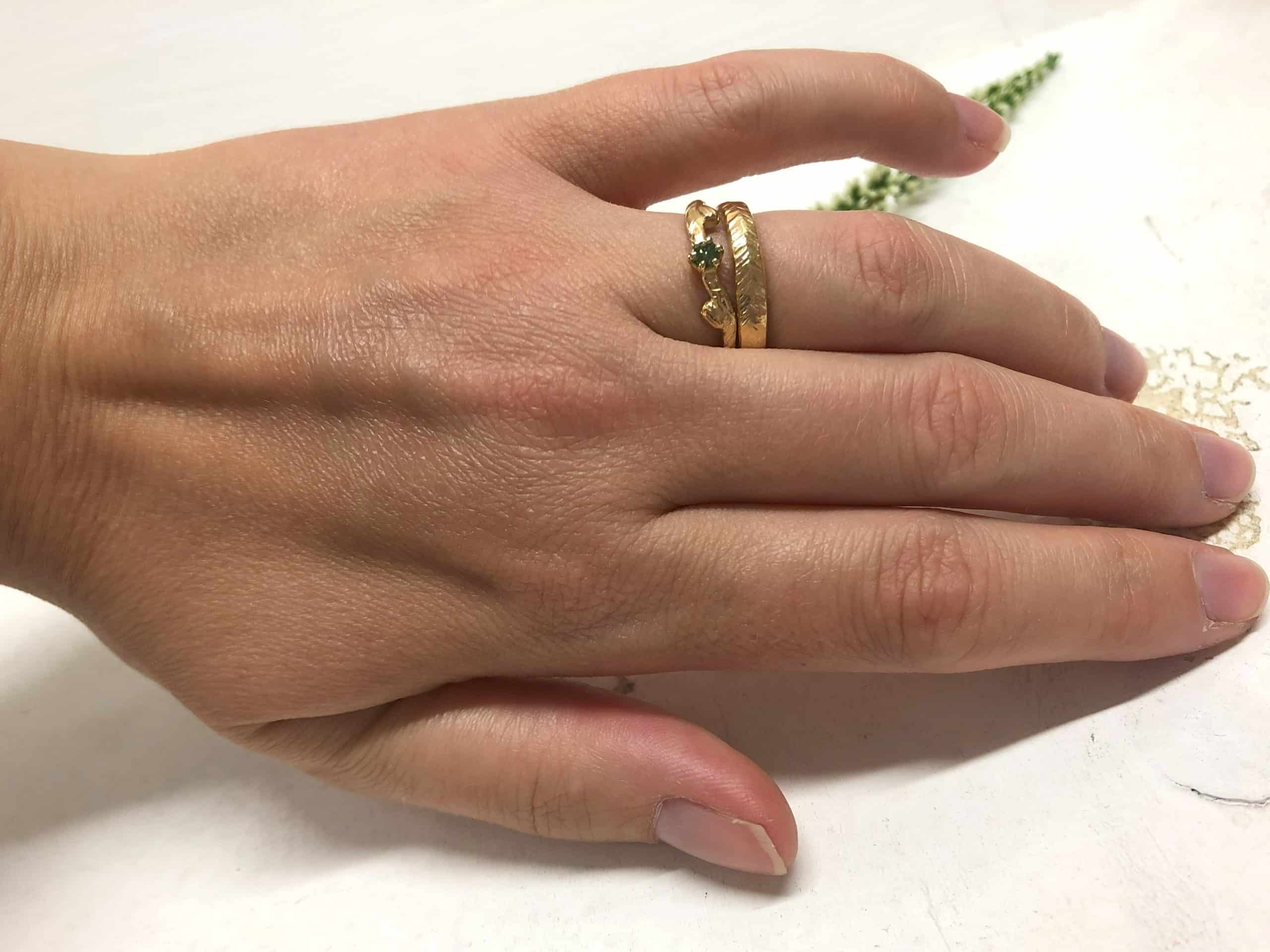 Der Ring mit Blättern und grünem Stein kann aufgrund seiner geschlungenen Form auch klasse direkt am Ehering getragen werden. Dies ist aber natürlich kein Muss, denn auch ohne einen zweiten Ring am Finger sieht der Rankenring einfach klasse aus. Ein Ring mit Blättern und grünem Stein harmoniert farblich übrigens perfekt zu einem Gelbgoldtrauring. In den Produktfotos siehst du, wie der Ring alleine getragen und auch in Kombi mit dem Ehering aussehen könnte. Toll oder?