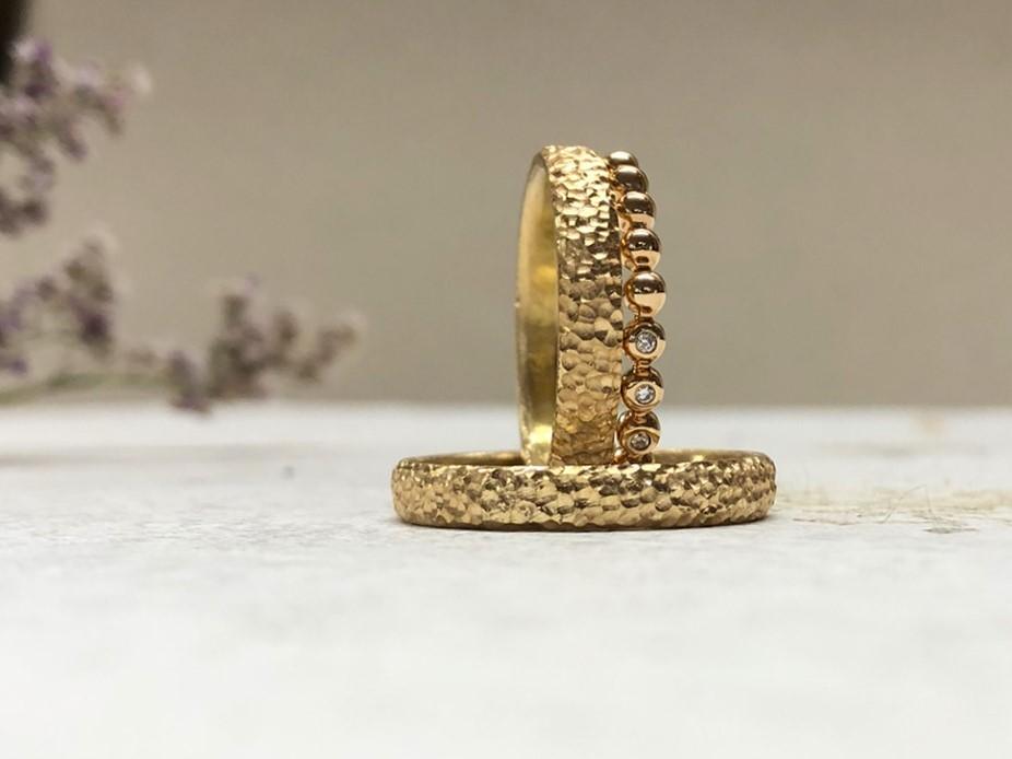 Mit verschiedenen Drehwerkzeugen wird jedes einzelne Grübchen bewusst platziert auf der Ringoberfläche. Jedes Grübchen hat eine ganz feine Maserung von den Werkzeugen. In den Grübchen fängt sich das Licht und so wirkt die Oberfläche sehr lebendig. Die Ringe haben also den coolen Hammerschlag Style, sind aber auf wartungsfreundliche Art und Weise gefertigt. Es ist also sehr wartungsfreundlich, für den Fall dass einmal eine Ringgrößenänderung oder eine Aufarbeitung am Ring gemacht wird.