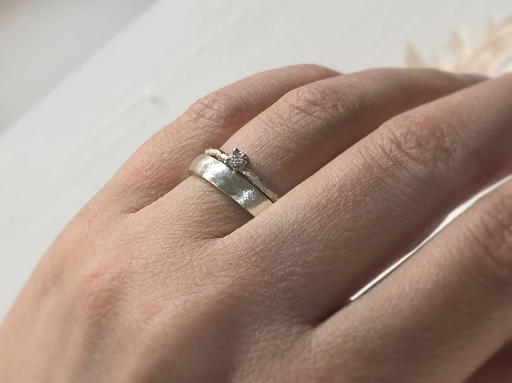 Die Oberfläche ist gekerbt mit Facetten und schön robust. Mit verschiedenen Goldschmiedewerkzeugen wird die Struktur in liebevoller Handarbeit auf dem Ring aufgearbeitet. So erzeugen wir eine tolle natürliche und florale Struktur, die kleine Kratzer und Macken, die durchs Tragen entstehen, versteckt. Ein facettierter Vorsteckring mit Stein sieht auch immer handgefertigt aus, einfach eine tolle Unikatoptik.