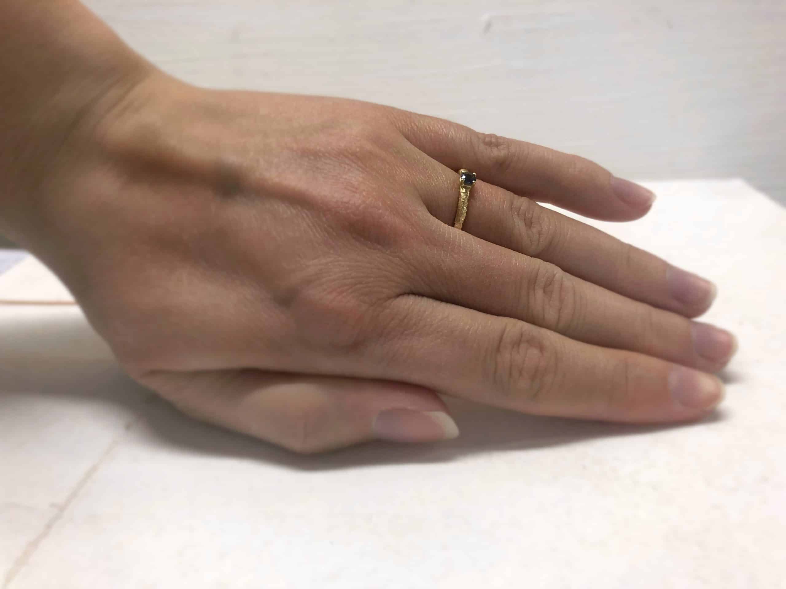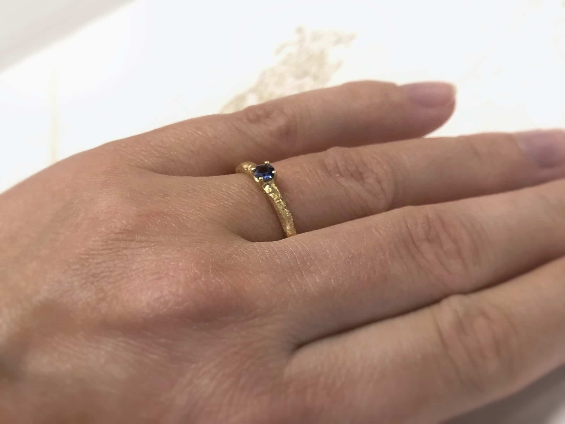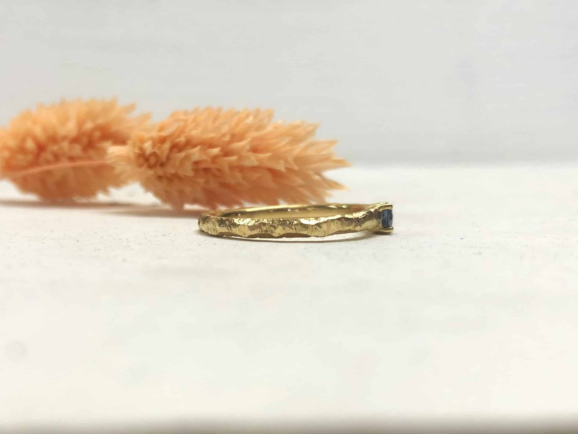 Es ist ein Mix aus Hammerschlagfacetten, gefeilten Facetten und winzigen eingefeilten Kerben. Auch seitlich am Ring ist diese robuste Oberfläche zu finden. Das facettierte Ringband sieht aus wie handgefertigt und genau das macht den Charme des Safirrings aus. Das Ringband erinnert uns immer ein wenig an Felsen, was gut zum Naturthema des Rings passt.