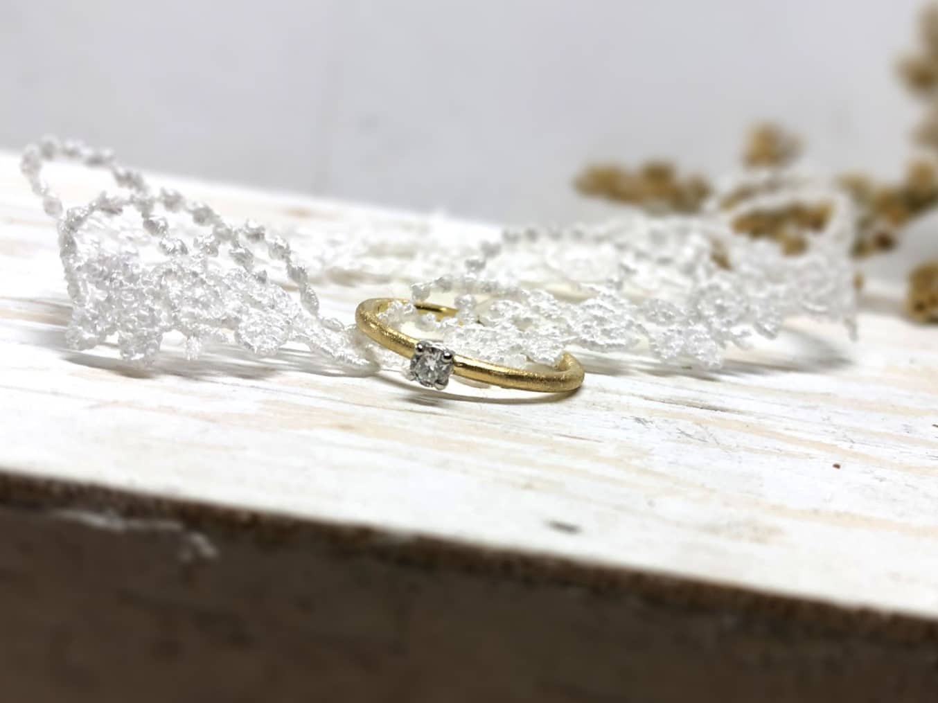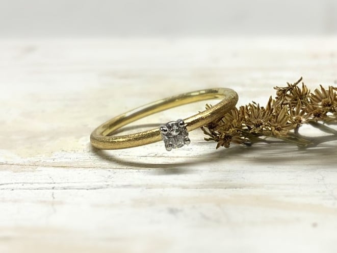 Simeona hat ein klassisches Verlobungsringdesign in Kombination mit einer modernen und mattierten Oberfläche. Mit verschiedenen Goldschmiedewerkzeugen wird das Ringband bewusst „zerkratzt“. So entsteht das sogenannte Eismatt. Diese Mattierung betont die Zweifarbigkeit von Gelb und Weiß wunderschön und macht die Oberfläche unempfindlicher gegenüber Kratzerchen.