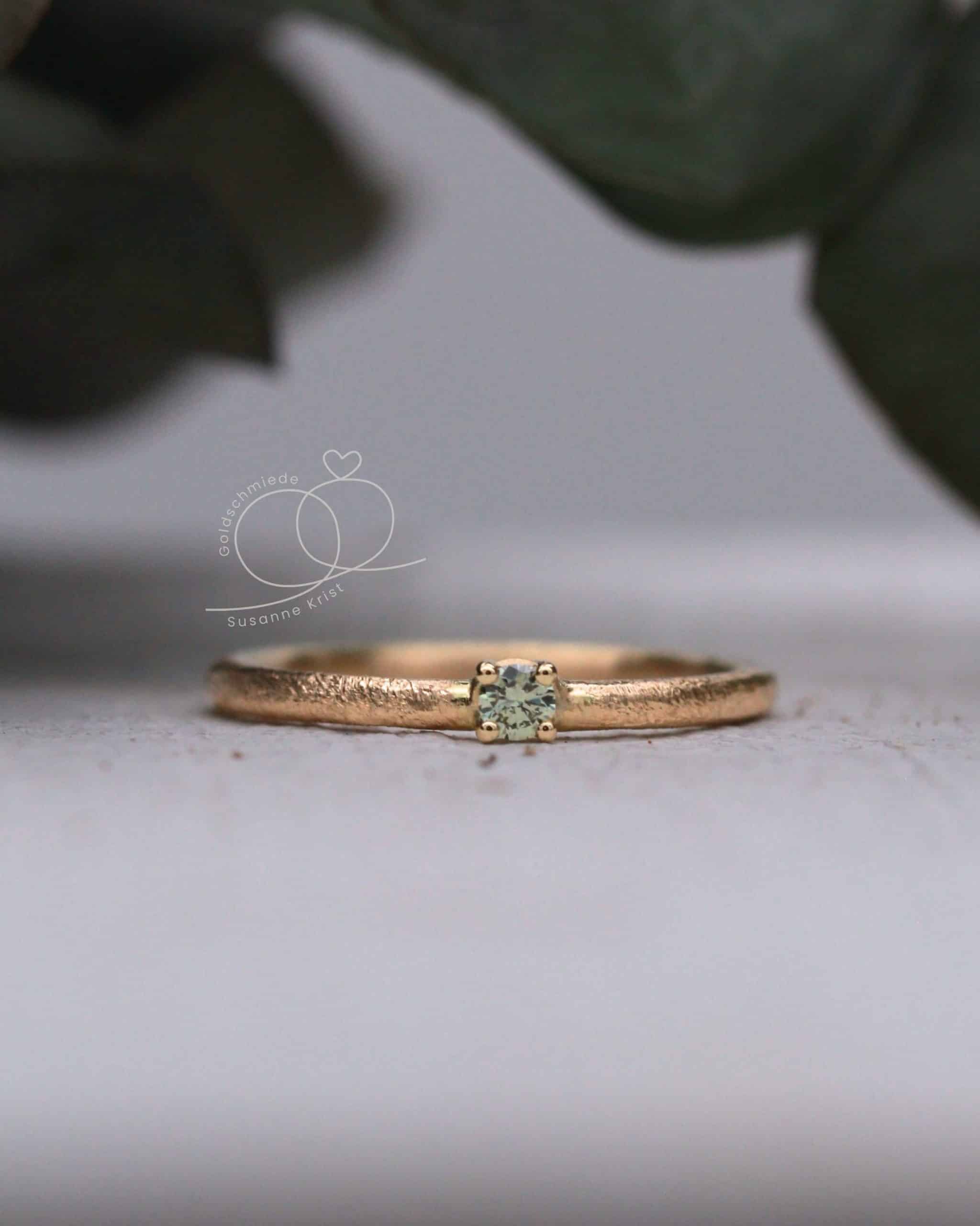 Ein glitzernder, hellgrüner Diamant, auch Brillant genannt, sitzt in einer Fassung mit 4 kleinen Ästen. Der minzgrüne Farbton ist etwas ganz Besonderes. Du hast die Wahl zwischen Hellgrün und Mittelgrün. Der Ring aus der Fotogalerie hat den hellgrünen Stein.