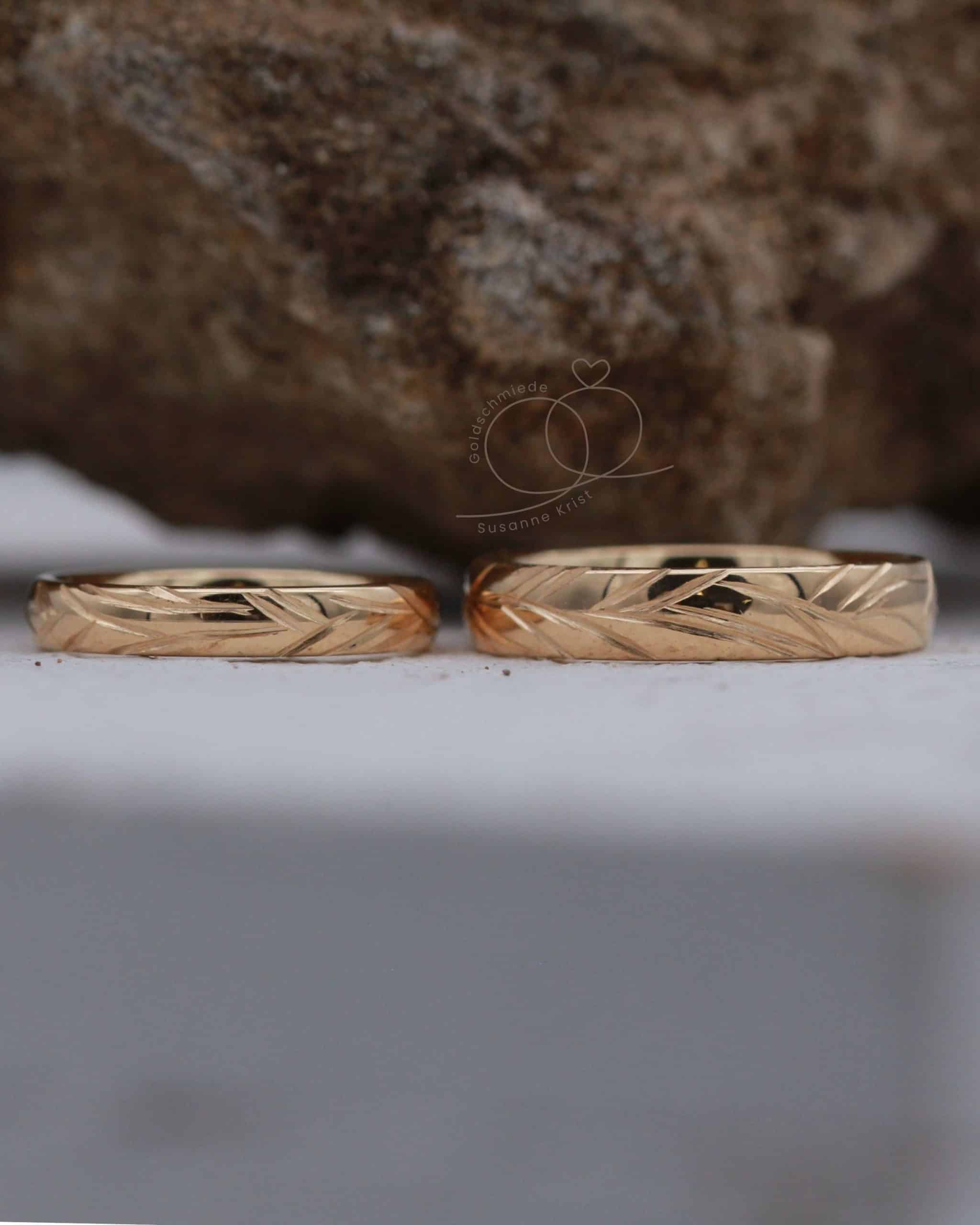 Was ich besonders an der Textur mag: Sie hat Charakter und ist langlebig. Denn jeder Trauring wird sich im Lauf der Zeit durch das Tragen etwas verändern. So wird die Struktur etwas mackiger und die Tragespuren kommen dazu. Die aussergewöhnliche Holzmuster Textur ist aber so tief eingearbeitet, dass sie erhalten bleibt. So behalten eure Ringe auch über lange Zeit den Charakter.