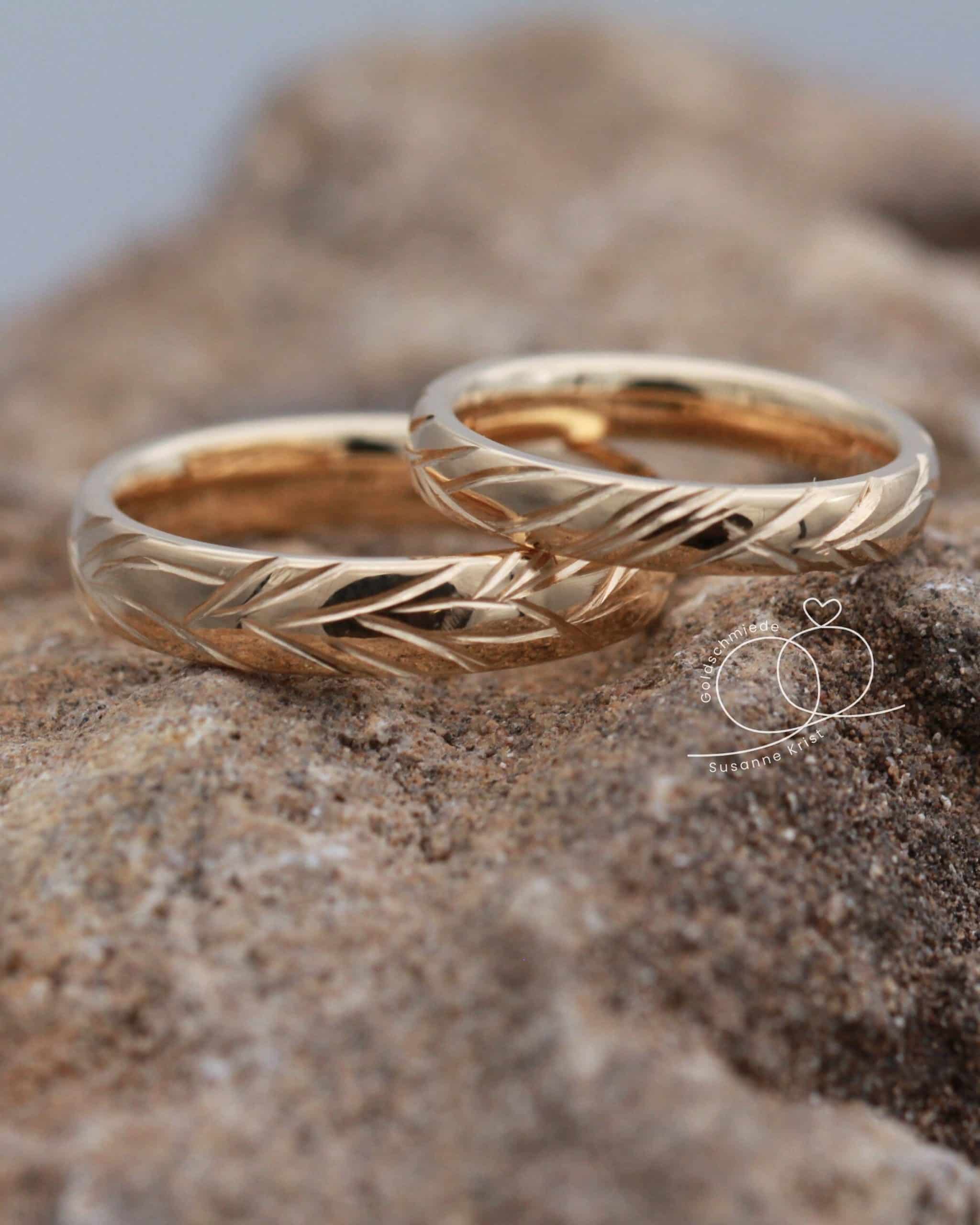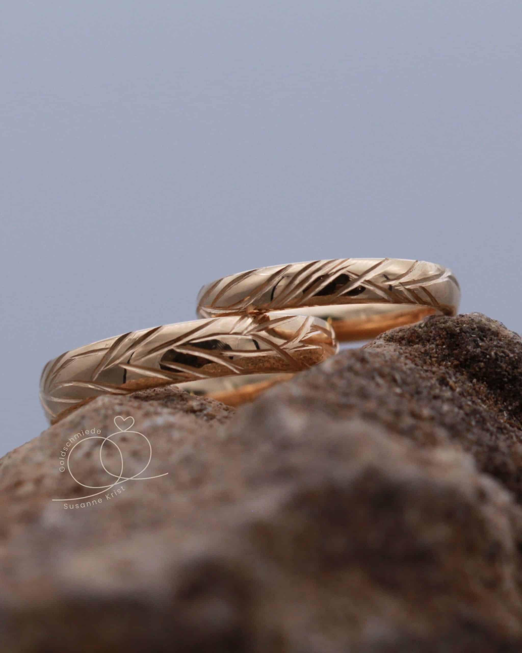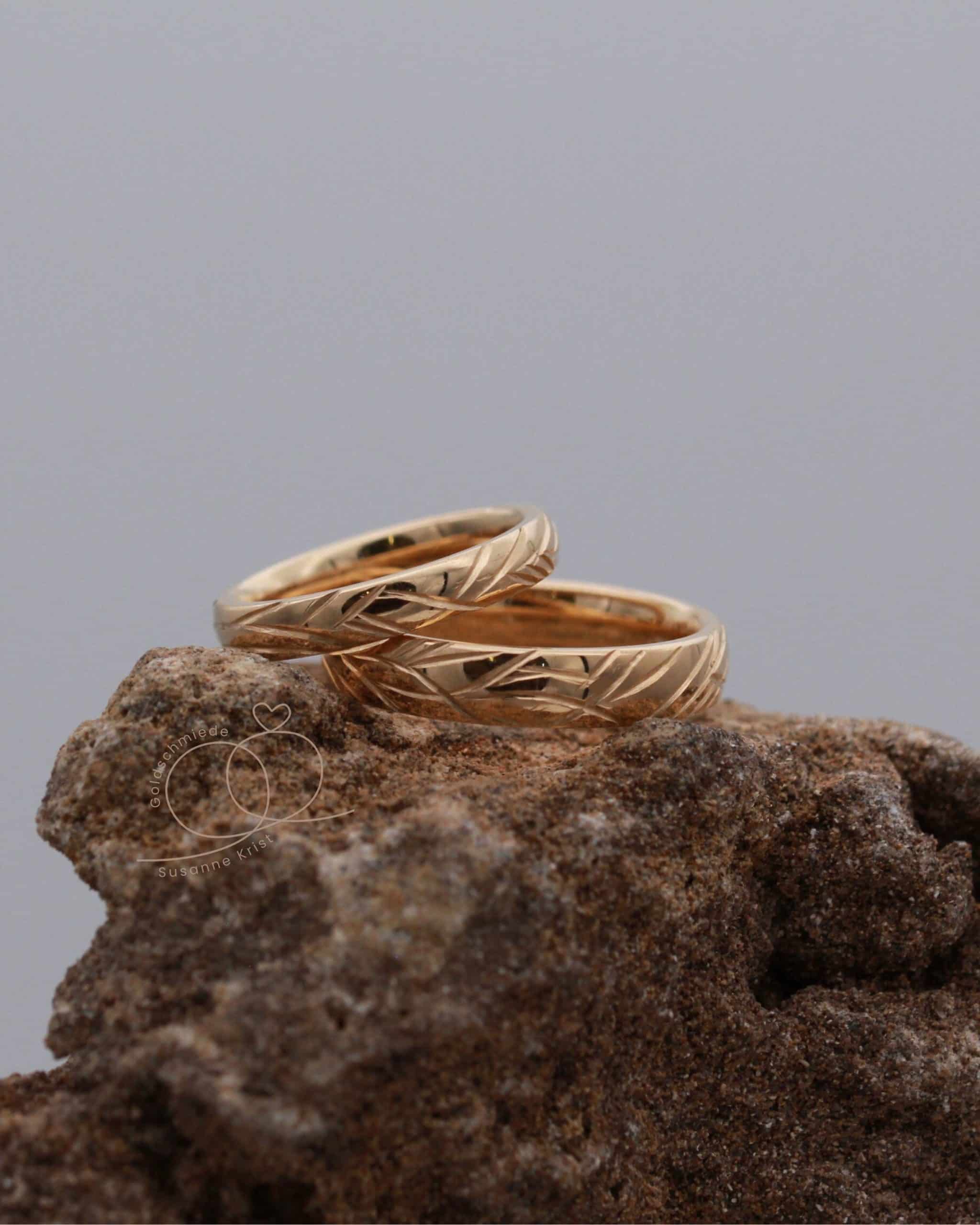 Die Ringe mit Holzmuster sind aus sattem Gelbgold. Das satte Gelbgold ist im Vergleich zum normalen Gelbgold eine Farbnuance mehr in Richtung Pfirsich. Eine traumhafte Farbe!