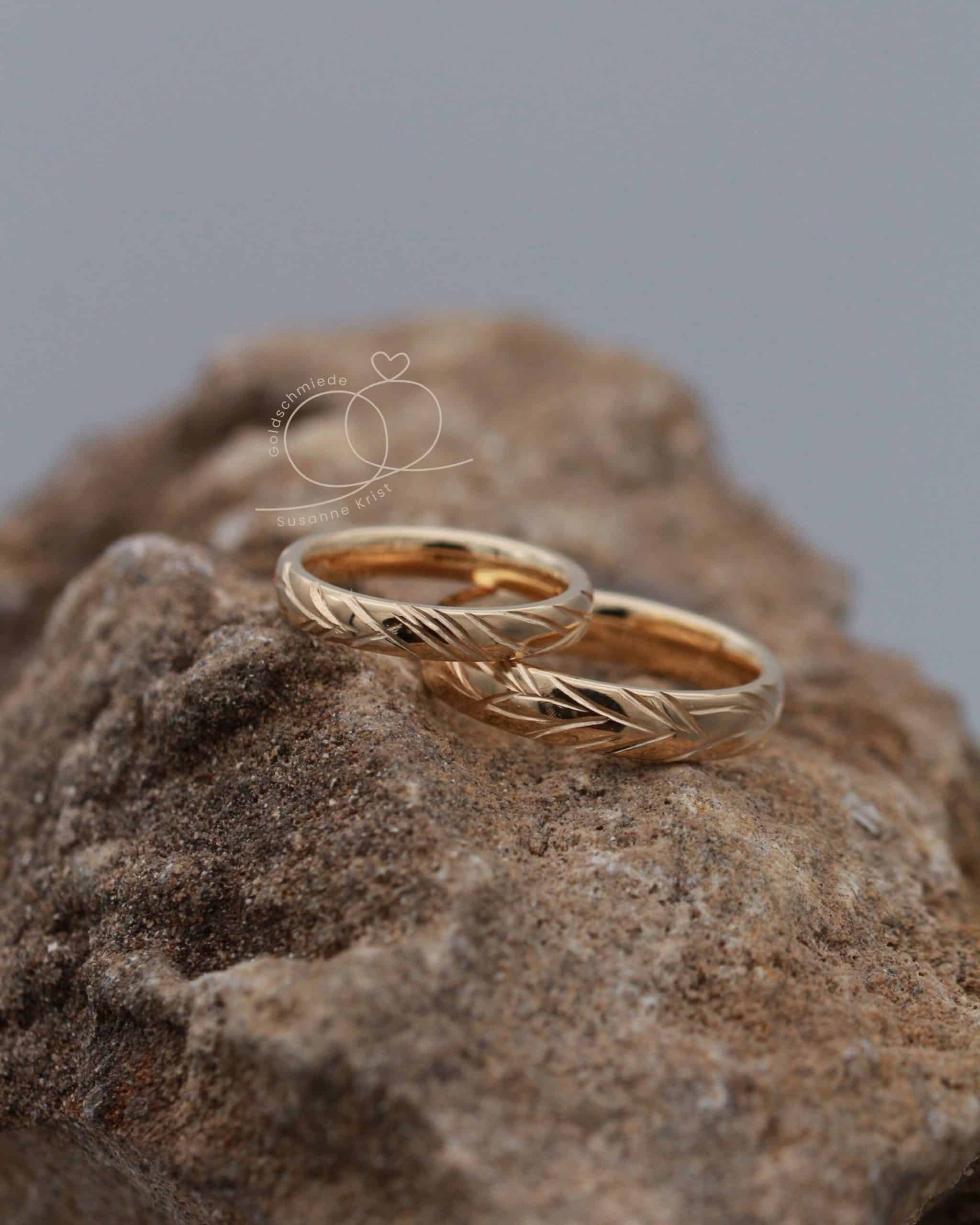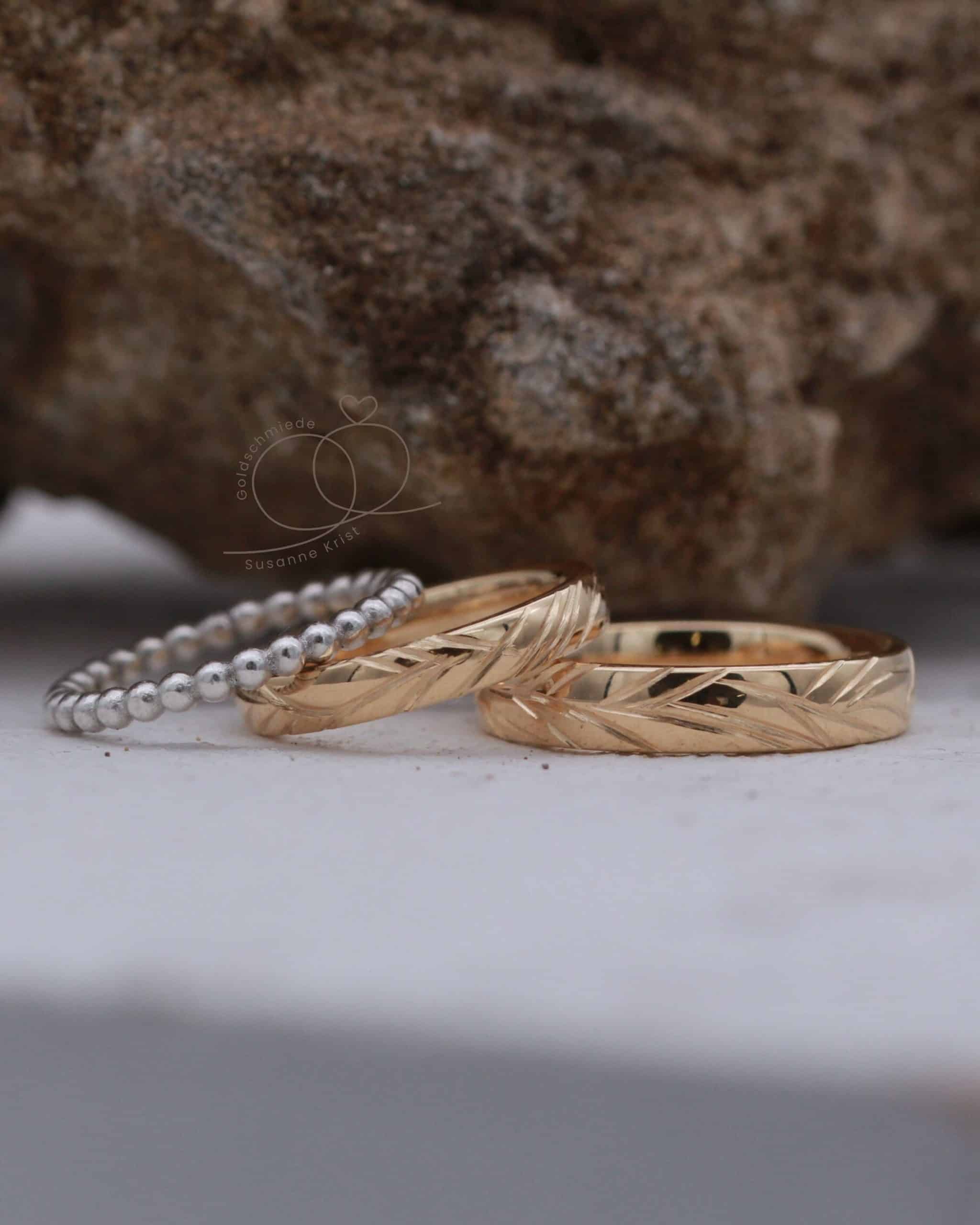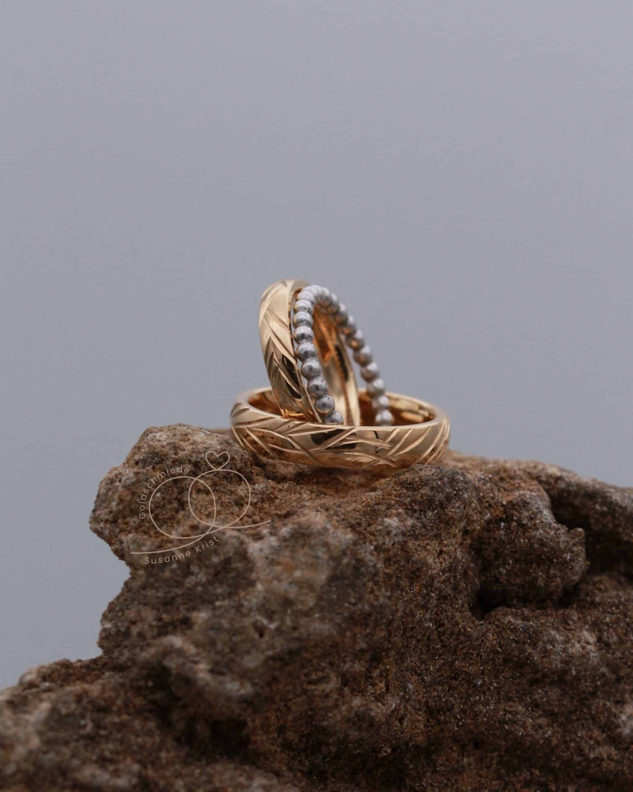 Bei der Goldqualität habt ihr die Wahl zwischen dem guten 585 Sattgelbgold oder dem noch besseren und haltbareren 750 Sattgelbgold. Die Qualitätsstufe 750 ist langfristig definitiv stabiler und trägt sich weniger ab. Da Eheringe im Alltag sehr beansprucht werden und lange getragen werden sollen, rate ich persönlich immer zum hochwertigen 750 Gold.