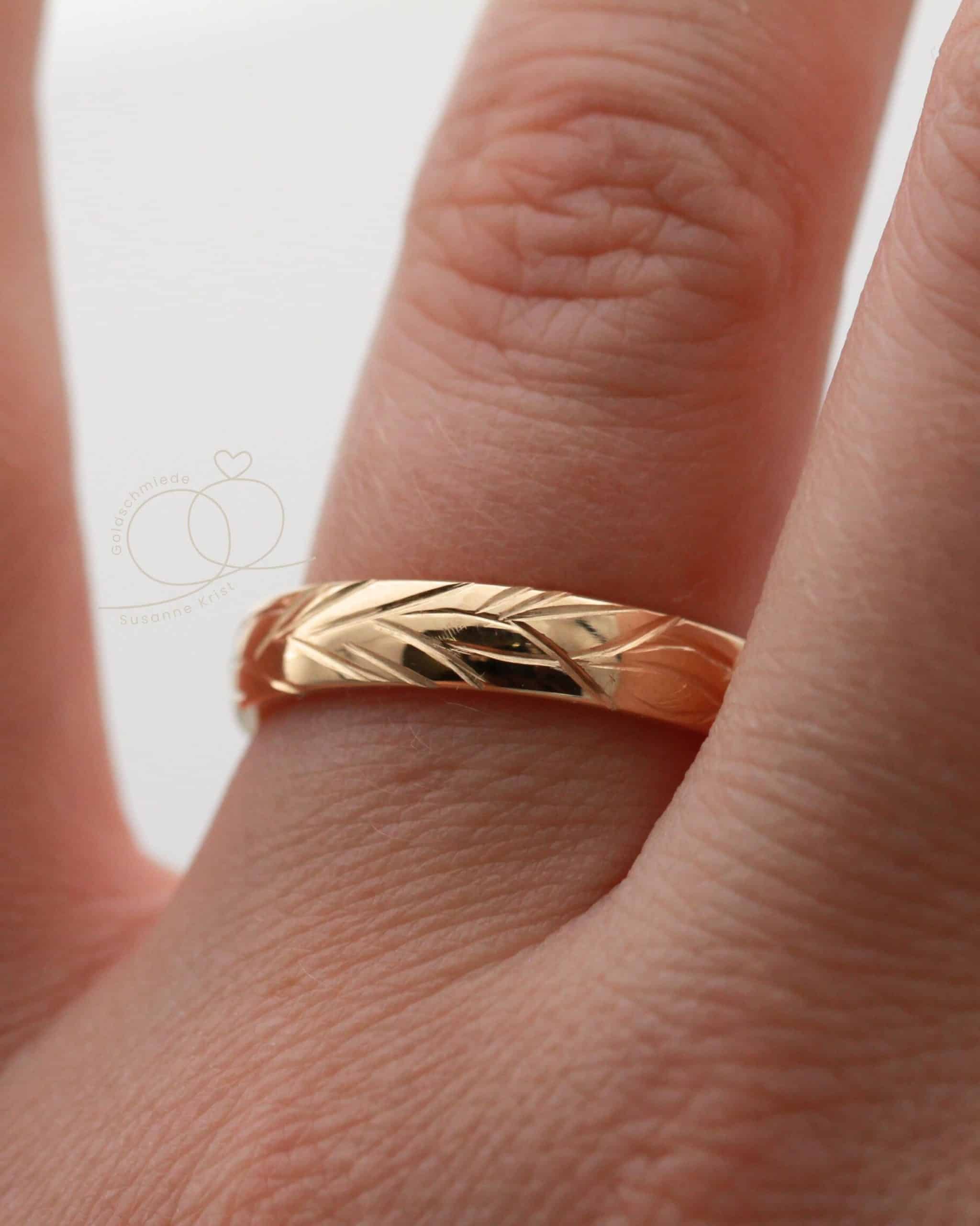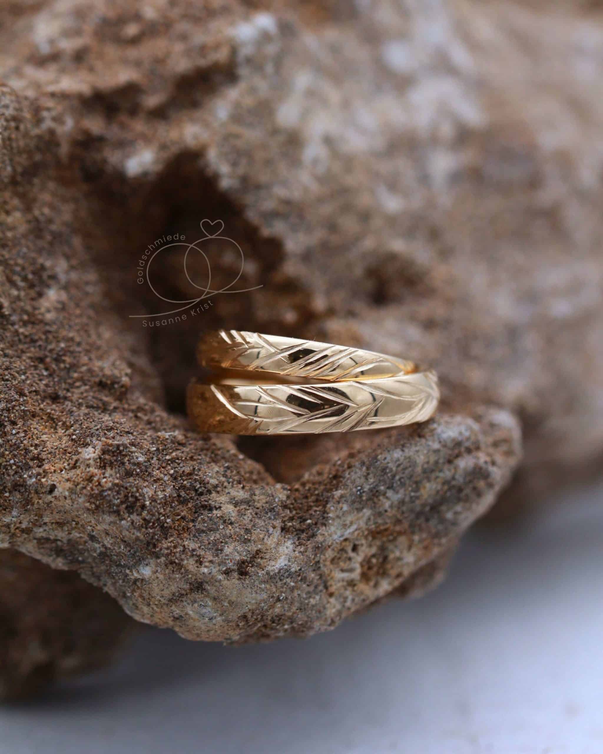 Inspiration für diese schönen Ringe mit Holzmuster sind Wälder und Bäume. Die wunderschöne Struktur namens „Sanddorn“ wird von mir mit verschiedenen Goldschmiedewerkzeugen eingearbeitet. Alles in Handarbeit. Jeder Ring wird ein Unikat.