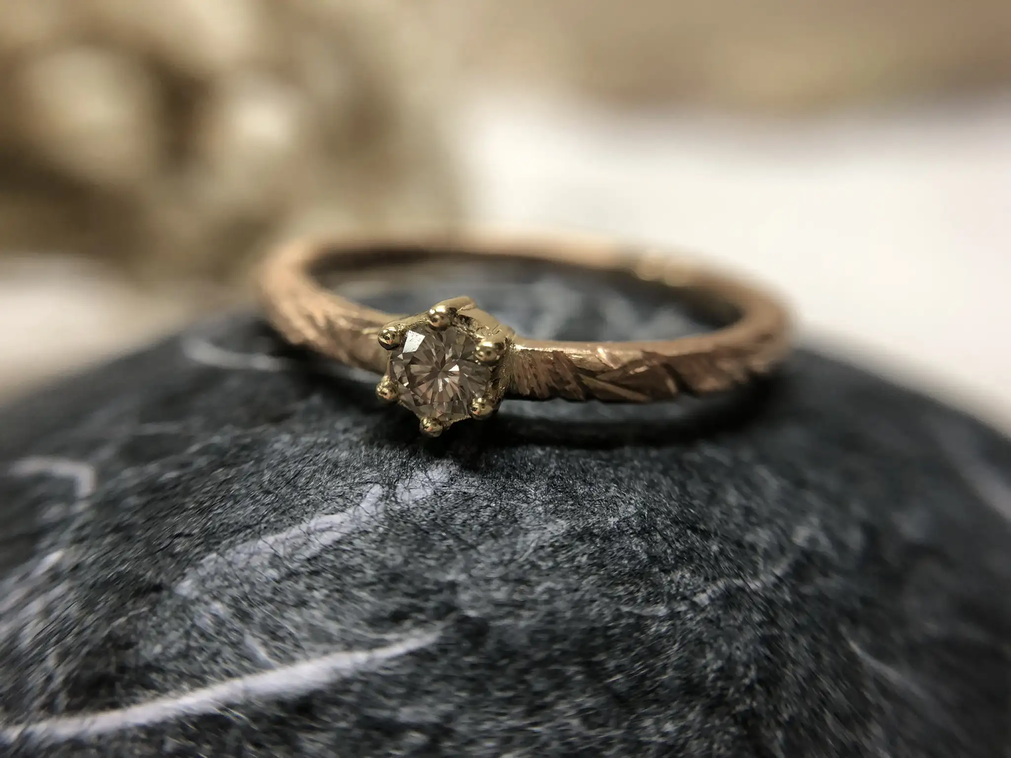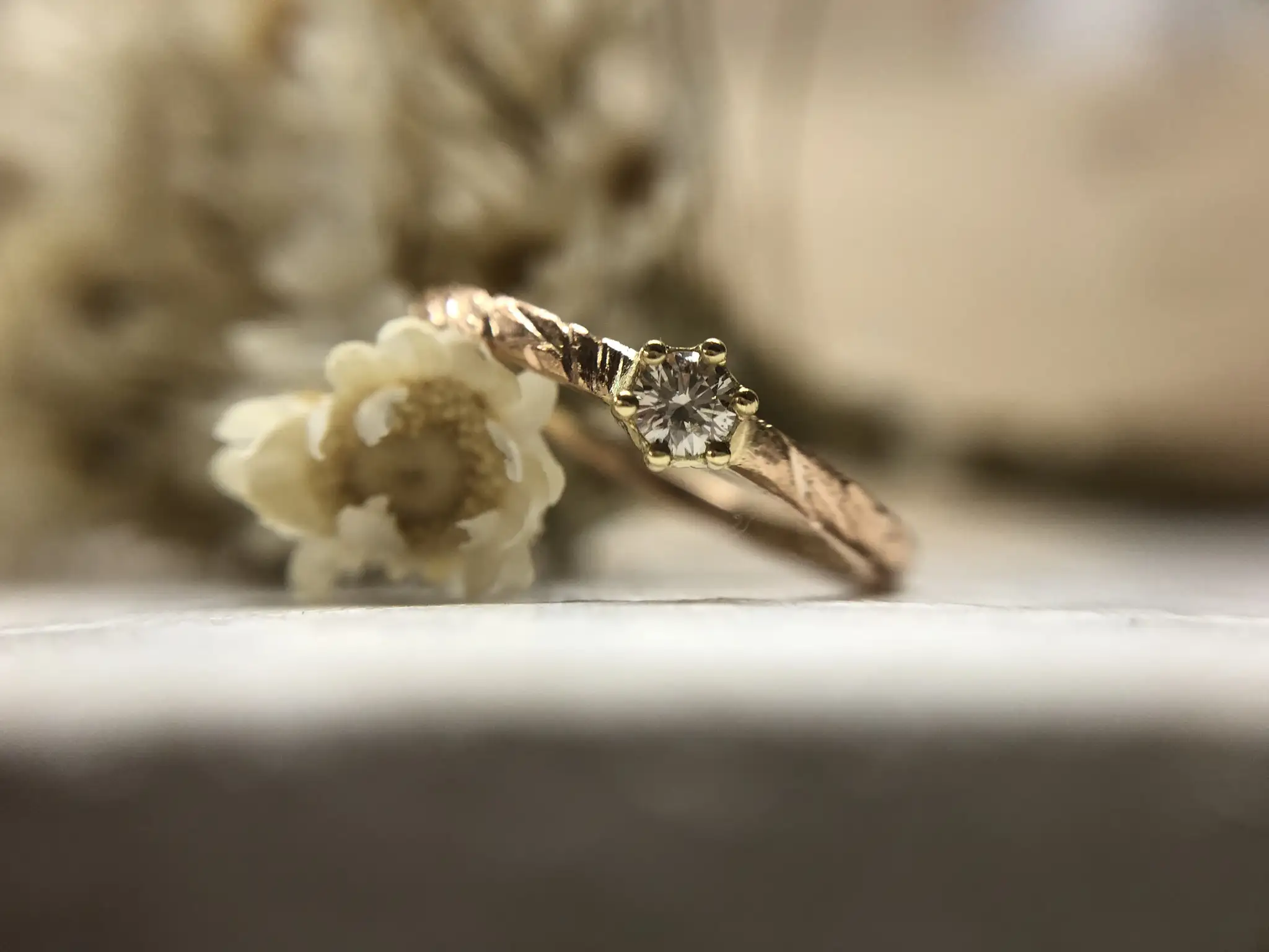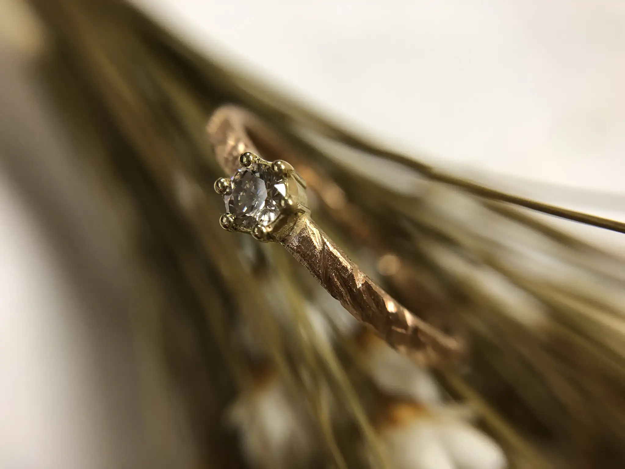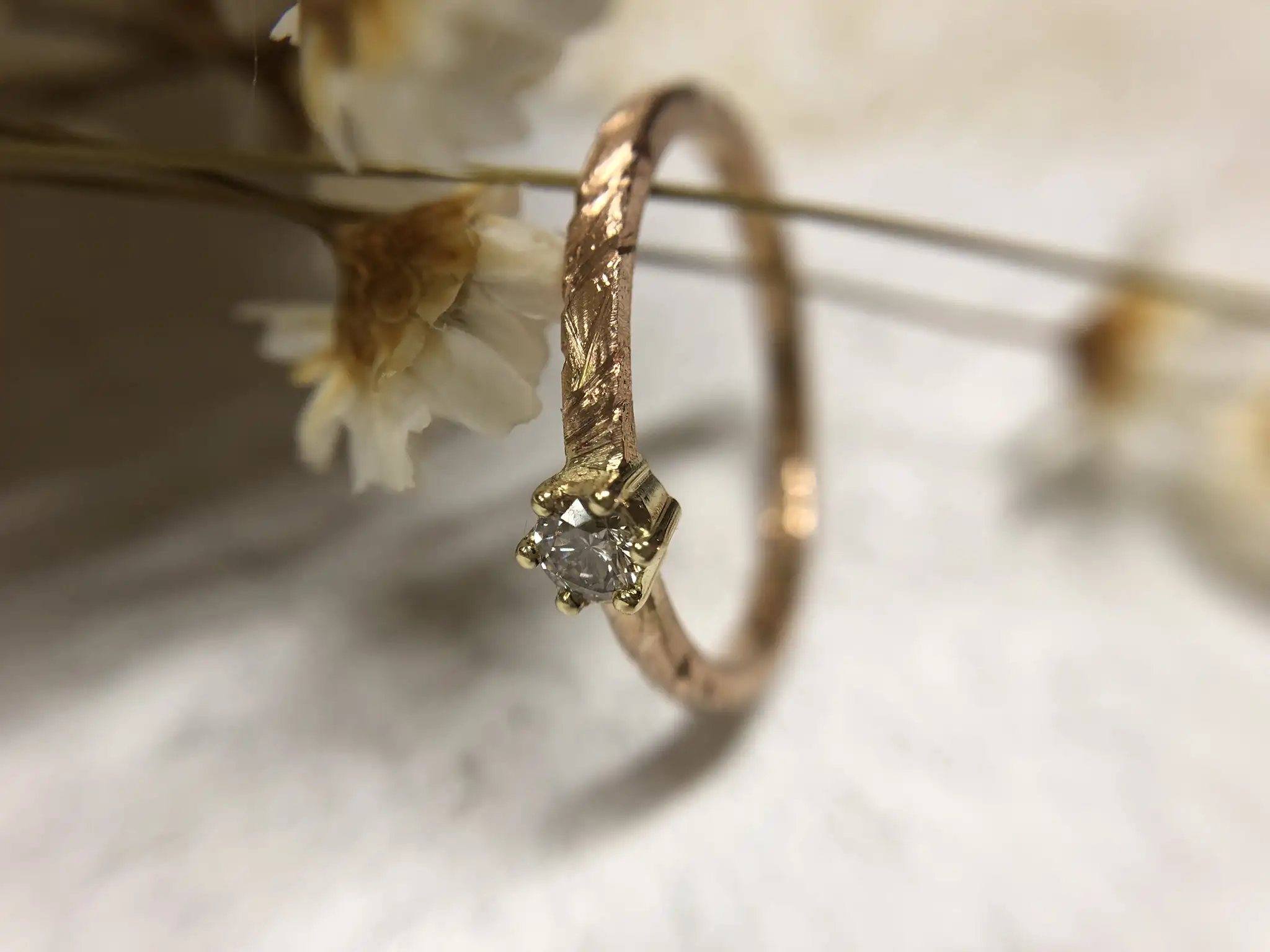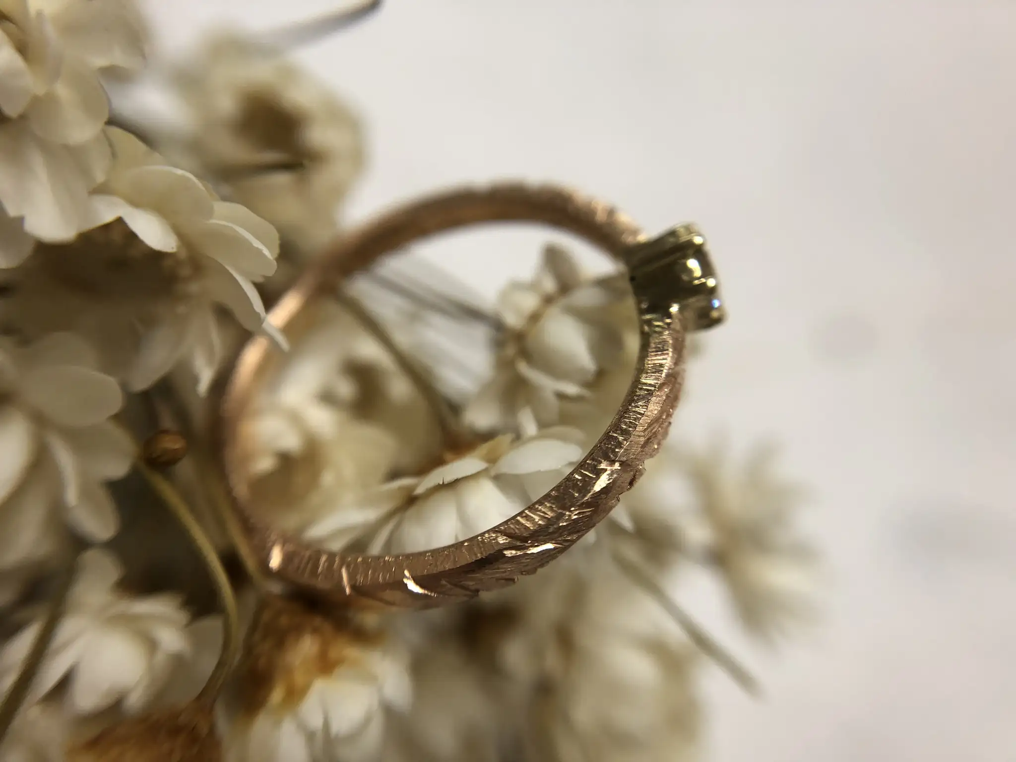 Der Rotgoldring mit Stein ist floral gehalten und hat eine astartige Struktur. Das Muster wird mit unseren Goldschmiedewerkzeugen mit großer Sorgfalt eingearbeitet. Die Kerben sind alle mit der Hand eingefeilt. Das Ringband wurde dann mit einem Schmirgelpapier sanft mattiert, so kommt der Farbton von Rotgold noch besser heraus. Jeder Acorna Ring wird ein wunderschönes Unikat. Die Struktur als solches nennt sich Sanddorn und die haben wir auch als Eheringstruktur im Sortiment.
