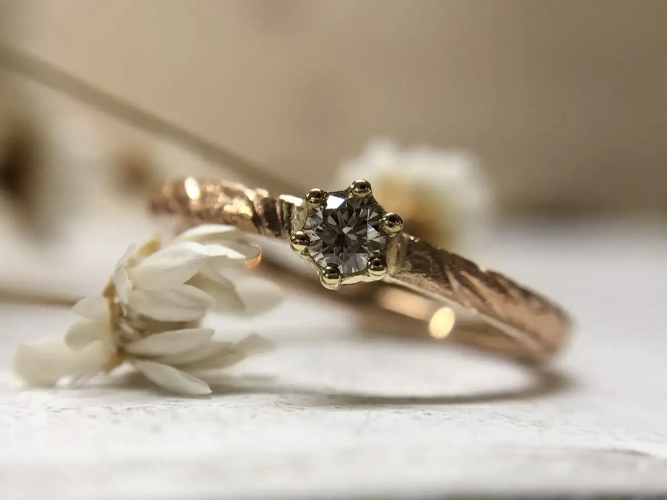Mittig funkelt Brillant in einer Fassung mit 6 Krallen, die den Stein halten. Brillanten bzw. Diamanten gibt es aber nicht nur in Weiss, sondern in allen Farben. Für den Rotgoldring mit Stein haben wir uns für ein sanftes Mittelbraun als Steinfarbe entschieden. Die Steinfarbe passt sehr gut zu Rotgold, so entstehen Herbstfarben. Der Ring hat einen natürlichen und trotzdem eleganten Look. Die Fassung selbst ist aus Haltbarkeitsgründen und als optischer Hingucker in Gelbgold gefertigt. Je nach Lichtverhältnis und Umgebungsfarben wirkt der Stein hellbraun bis mittelbraun, das Rotgold mal kräftiger und mal sanfter. Einfach ein tolles Licht-Schattenspiel.