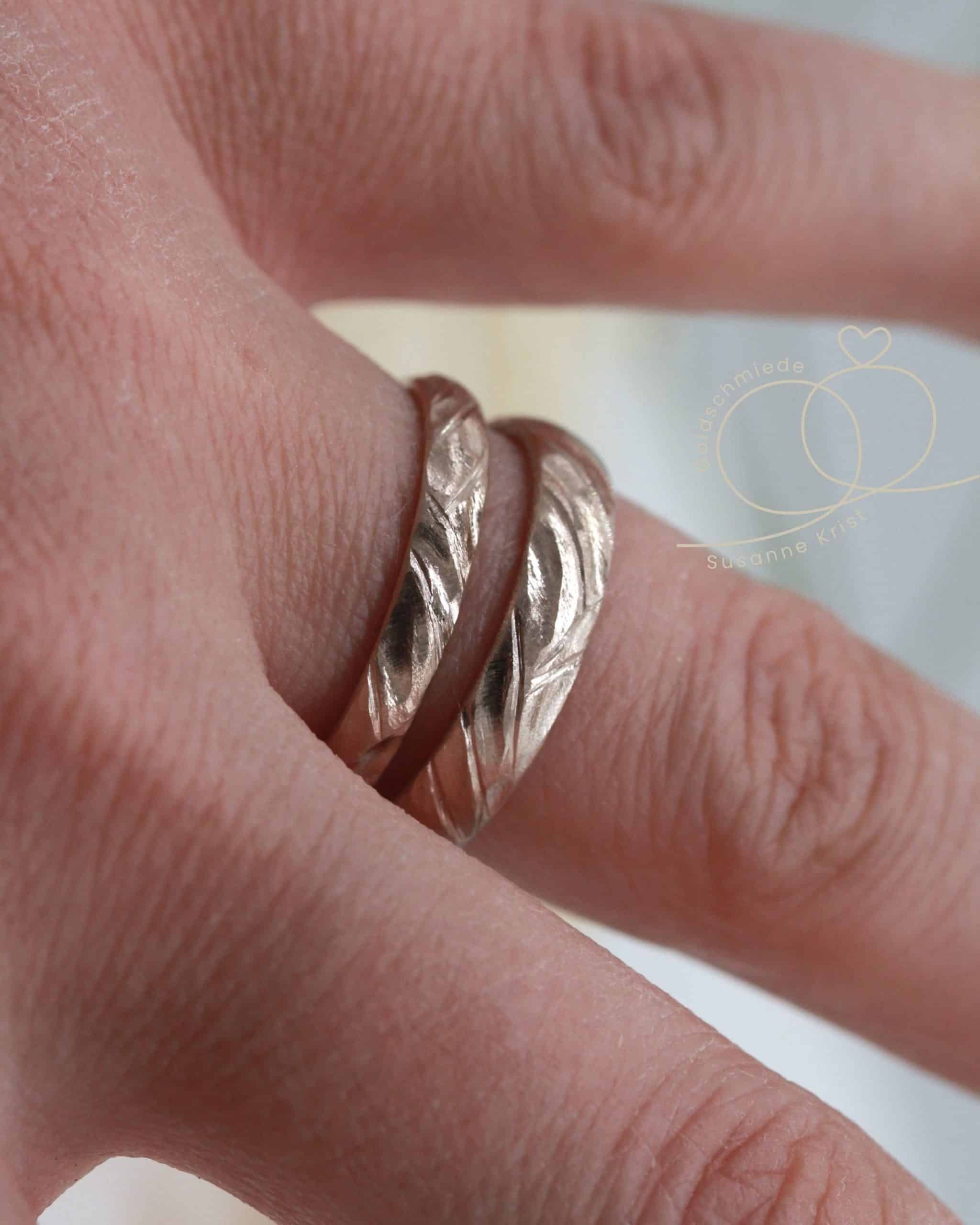 Ring 1 ist 3,5 breit und 1,7 mm stark. Der breitere Ring 2 ist 4 mm breit und 1,7 mm stark. Da es sich um Ringe mit starker Struktur handelt, kann es natürlich kleine musterbedingte Maßabweichungen geben. Das Muster lässt sich auch gut mit einem vorhandenen Verlobungsring kombinieren, wie es bei einem Bild der Galerie zu sehen ist.