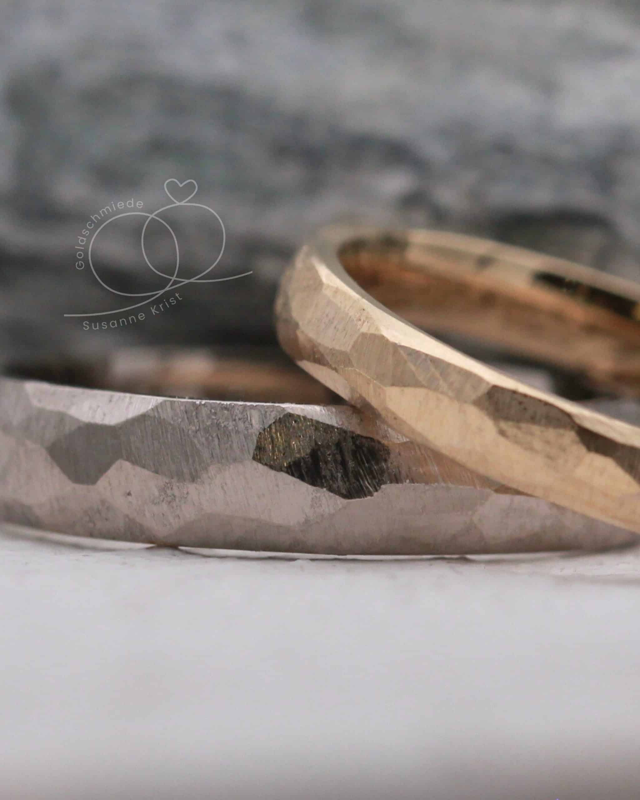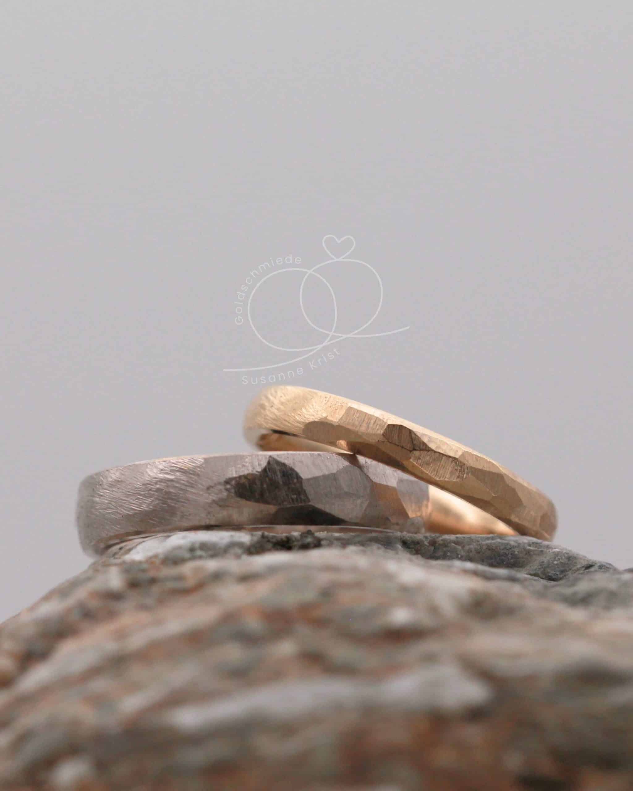 Wenn ihr besondere und unterschiedliche Trauringe sucht, die nicht jeder hat, könnte euch das Ringpaar Wanderlust gefallen: Unterschiedliche Trauringe bezaubern durch ihre Kontraste von Farbe und Textur!
