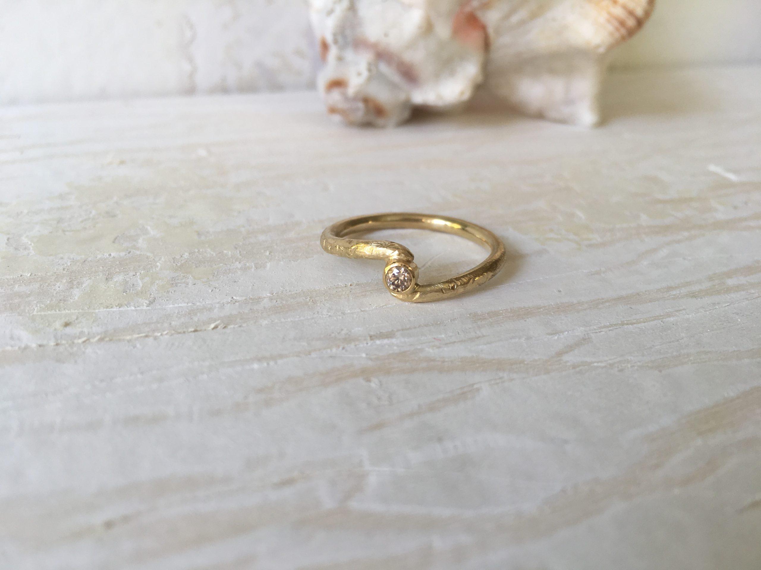 Ganz raffiniert in das verschlungene Ringband eingearbeitet, sitzt eine Fassung mit naturfarbenem Brillant. Die Fassung ist glatt und hat kleine Hammerschlagfacetten am Rand, wodurch der natürliche Charakter von Minarvi vervollständigt wird.