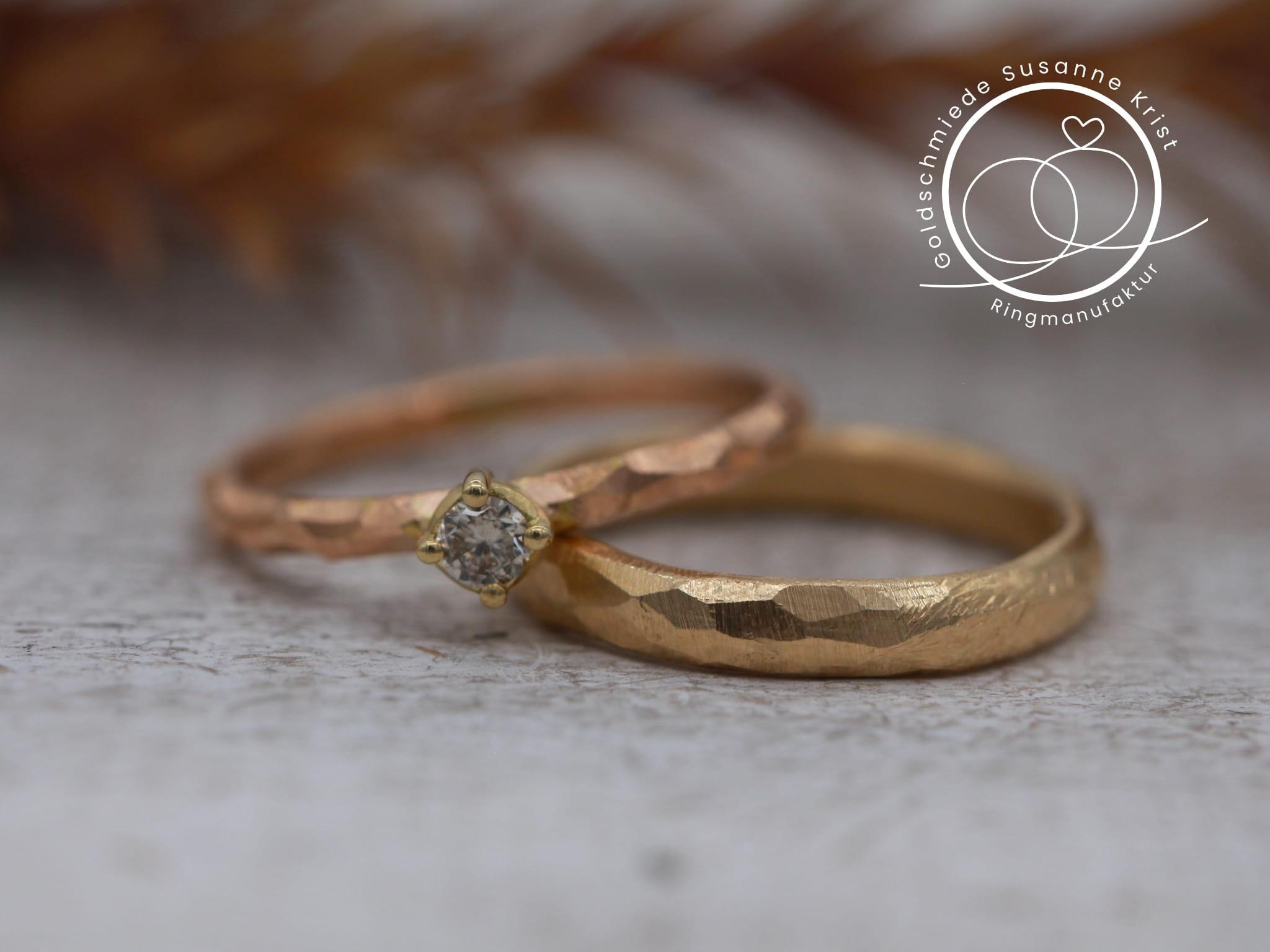 Mit verschiedenen Drehwerkzeugen wird jedes einzelne Grübchen bewusst platziert auf der Ringoberfläche. Jedes Grübchen hat eine ganz feine Maserung von den Werkzeugen. In den Grübchen fängt sich das Licht und so wirkt die Oberfläche sehr lebendig. Die Ringe haben also den coolen Hammerschlag Style, sind aber auf wartungsfreundliche Art und Weise gefertigt. Es ist also sehr wartungsfreundlich, für den Fall dass einmal eine Ringgrößenänderung oder eine Aufarbeitung am Ring gemacht wird.