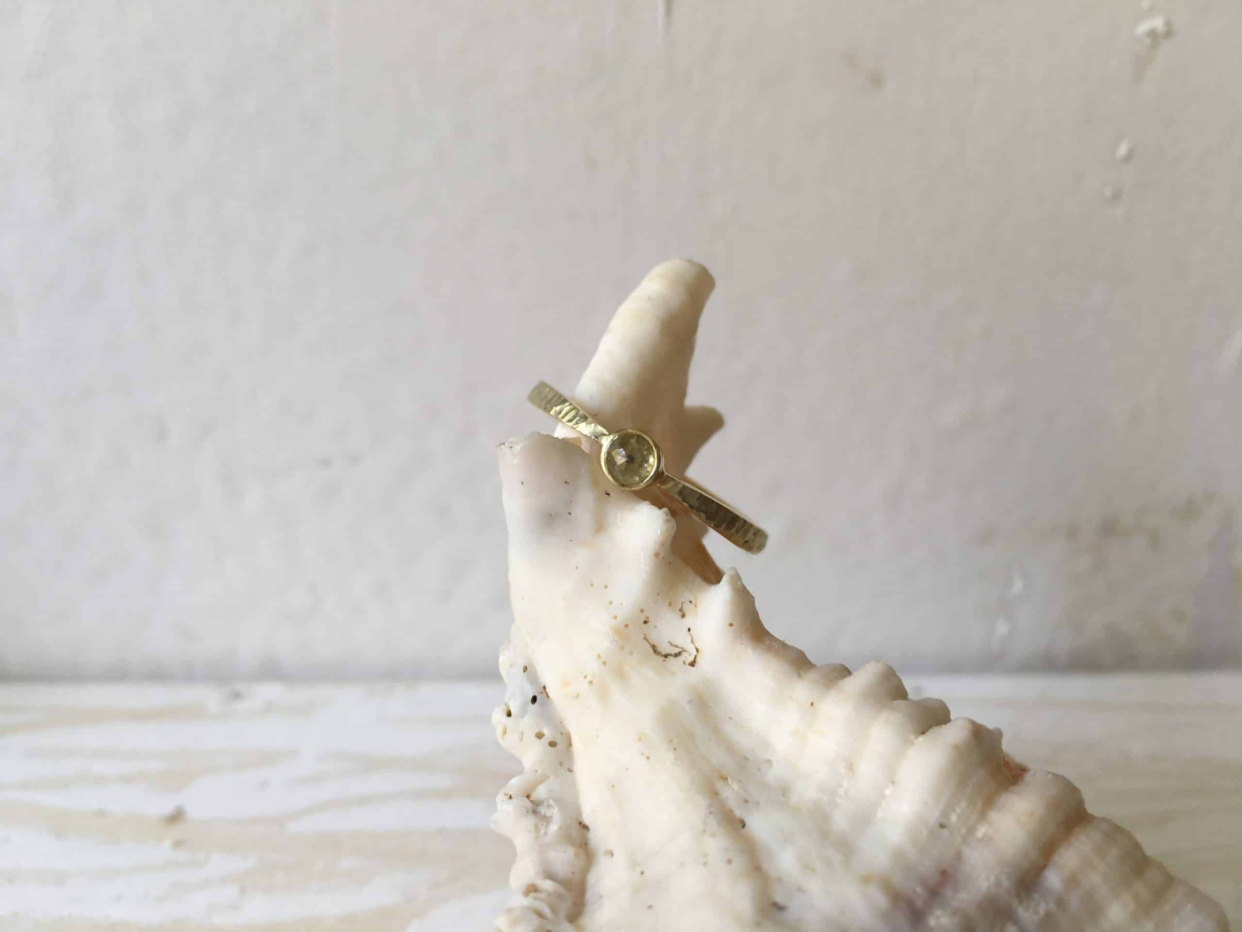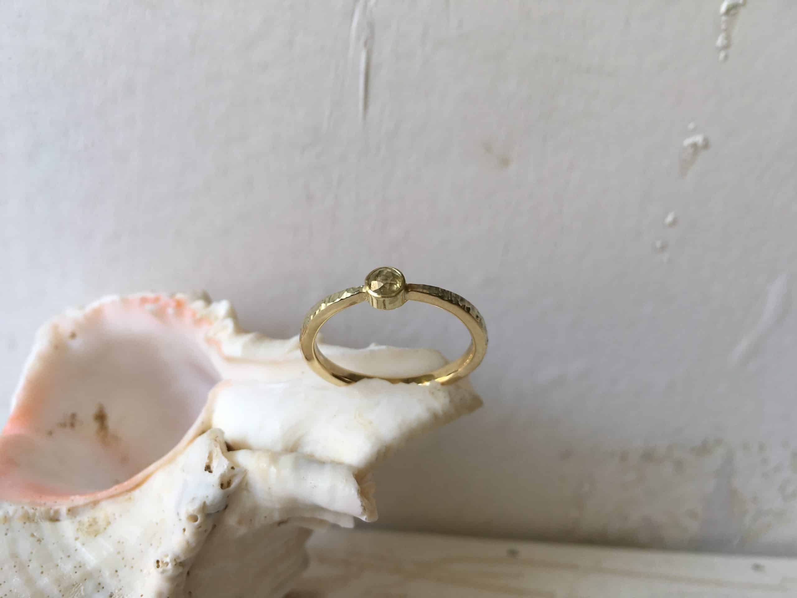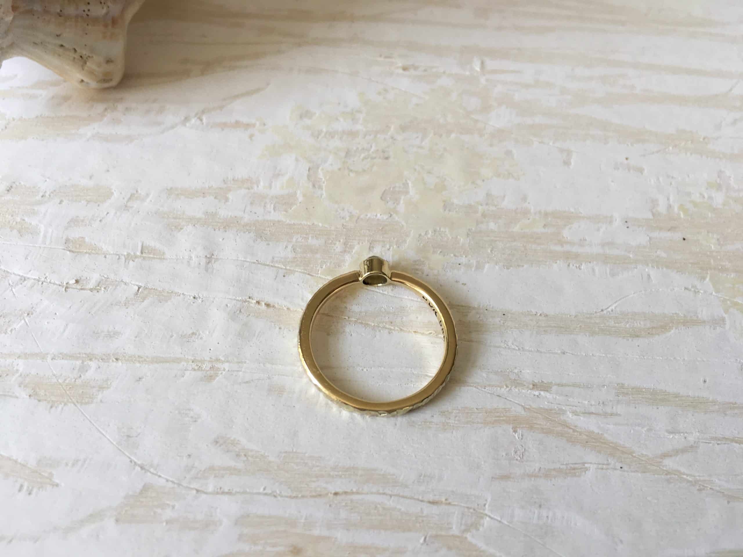 Mit verschiedenen Goldschmiedewerkzeugen wird die Musterung tief in den Ring eingearbeitet. Es entsteht eine lebendige Struktur, die an Urlaub am Meer und versteckte Strände erinnert. Jede Buchtoberfläche wird einzigartig, es wird keine Struktur zwei mal geben. Einfach etwas ganz Besonderes.