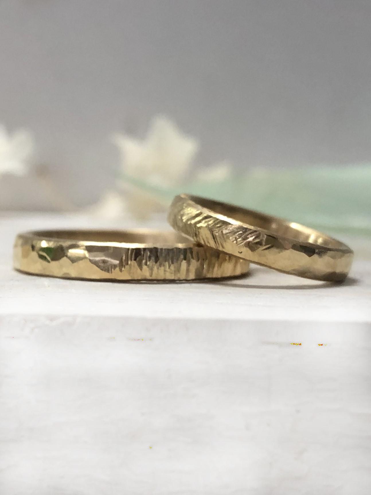 Facettierte Eheringe mit Hammerschlag Optik! Lebendige und natürliche Ausstrahlung.