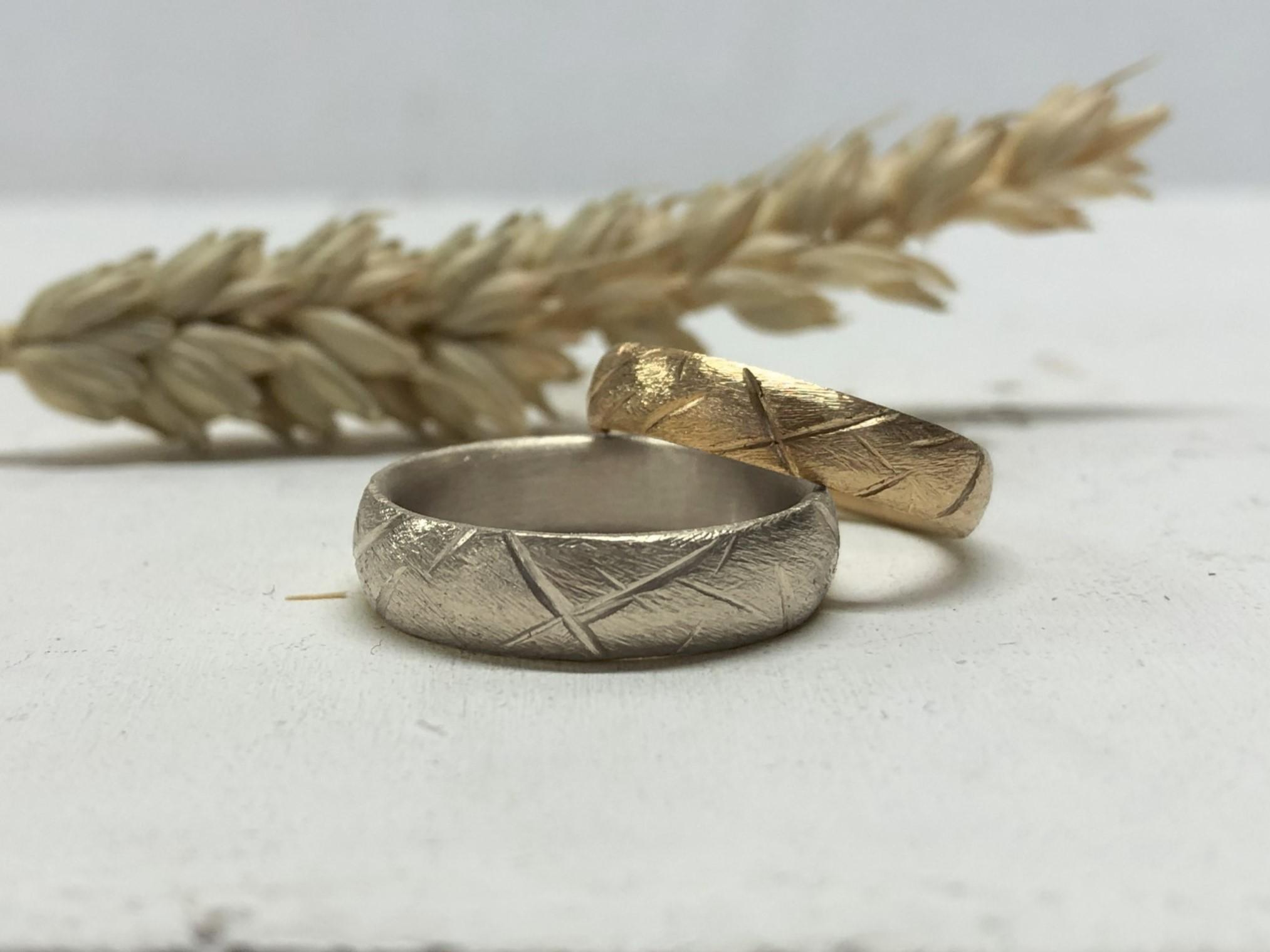 Wenn euch mehrere Oberflächen gefallen: Wir machen übrigens auch Doppelmuster Ringe, bei der die eine Ringhälfte eine Struktur hat und die andere Ringhälfte eine andere Struktur. So müsst ihr euch nicht zwischen euren Favoriten entscheiden und könnt beide haben. In vielen Fällen wird eine Struktur als gemeinsame Hauptstruktur gewählt und dann in Kombi mit einer weiteren Struktur, die jeder für sich selbst auswählt.