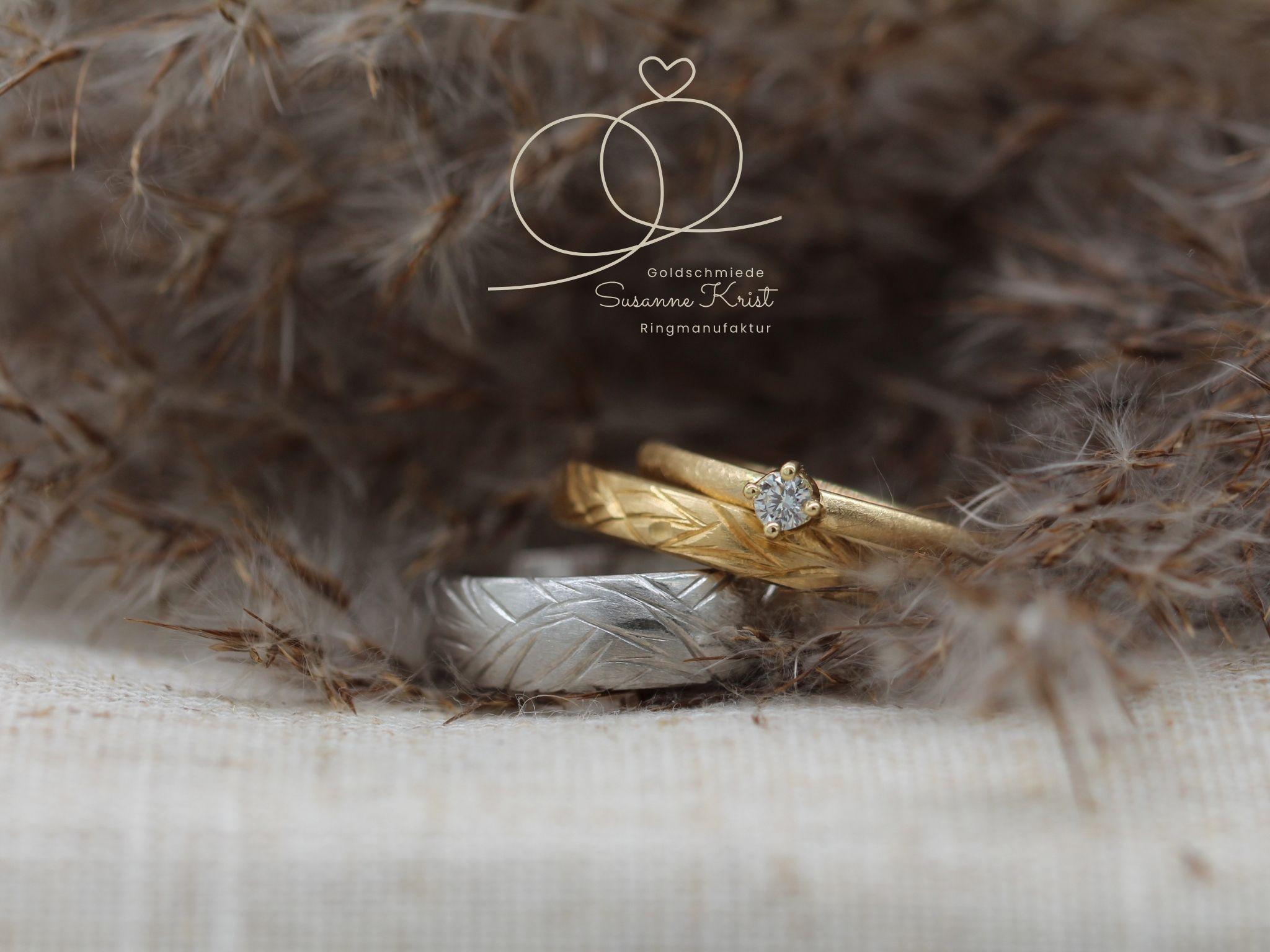 Auf der einen Ringhälfte ist eine Struktur und auf der anderen Hälfte eine andere. Das gibt es so nur bei uns. Die Inspiration für Susanne war, sich nicht entscheiden zu müssen, wenn einem gleich zwei Ringoberflächen gut gefallen.
